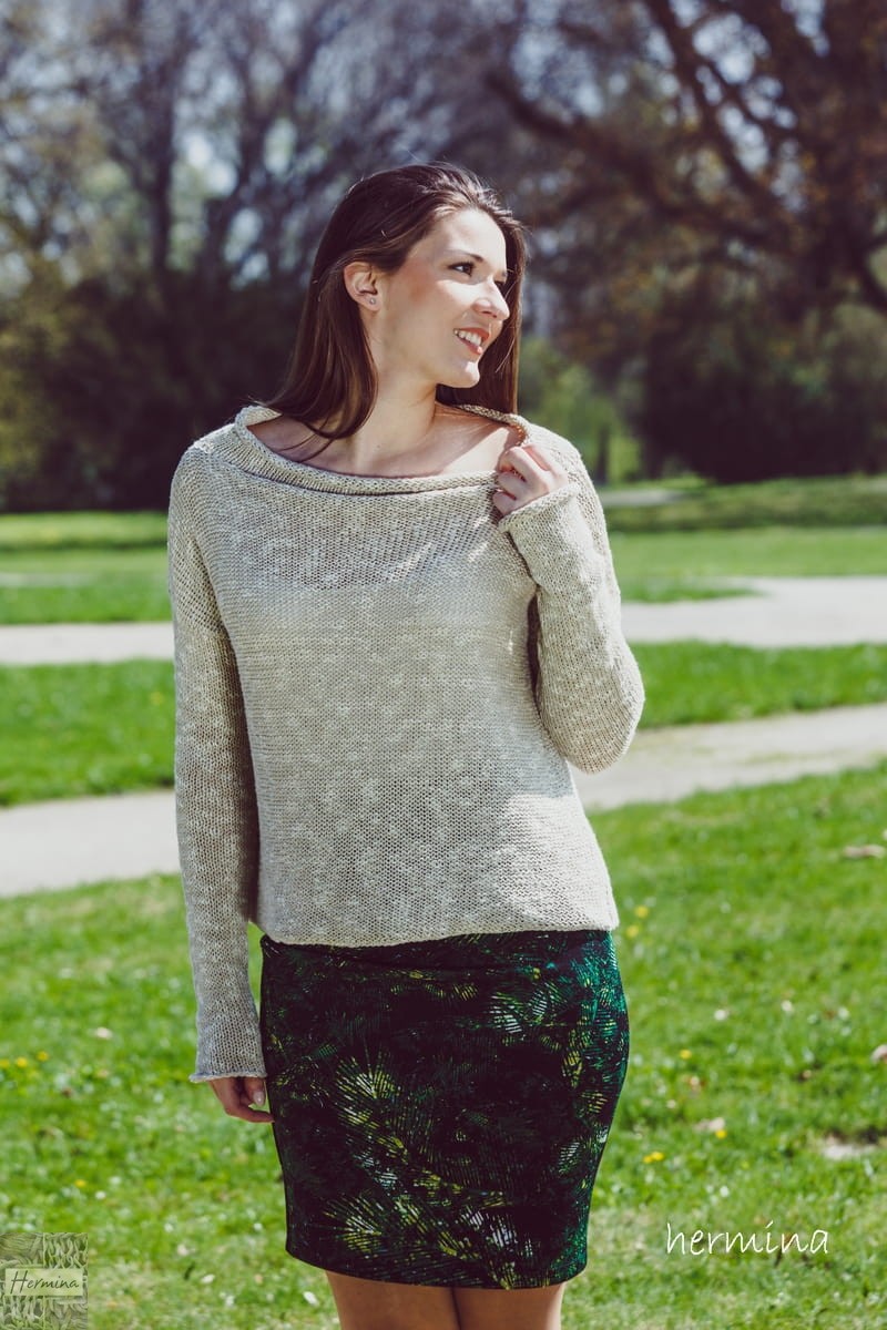 Bluzka z dzianiny o luźnym kroju wykonana z bawełny z fantazyjną guzkową nitka, w prostej formie z dekoltem w kształcie łódki. Idealna na przejściowe porę roku. Dzianina wykonana na ręcznej maszynie dziewiarskiej typu vintage. Szeroki, luźny krój jest wygodny i maskuje niedoskonałości figury. Doskonale sprawdzi się do eleganckich stylizacji jak również na co dzień. Dostępna w kolorze beżowym z fantazyjną jasą nitką. Bluzka dostępna w rozmiarach: M, L