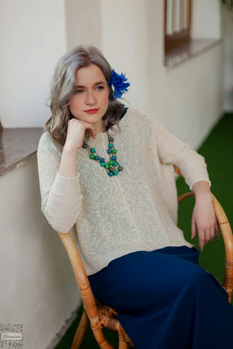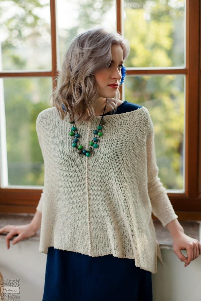 Oversizowa luźna bluzka z fantazyjnej bawełny wykonana na ręcznej maszynie dziewiarskiej, wykończona szydełkiem. Idealna na każdą porę roku. Luźny, swobodny fason z dekoltem w kształcie łódki pozwala na wiele stylizacji. Oversizowa forma bluzki nadaje jej lekkości i oryginalności a kolor e'cru sprawia, że doskonale sprawdza się w oficjalnych stylizacjach jak i na co dzień.