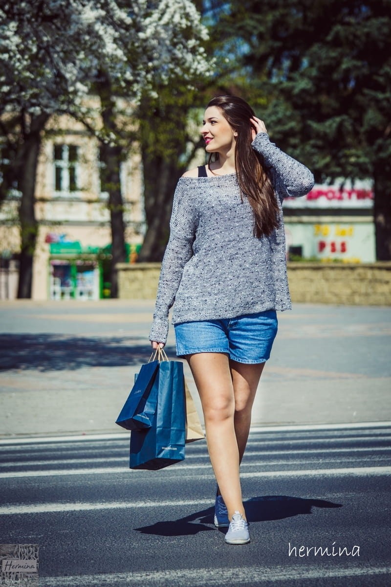 Bluzka z dzianiny o luźnym kroju wykonana z wysokiej jakości bawełny, w prostej formie, dekolt w kształcie łódki. Idealna na każdą porę roku. Dzianina wykonana na ręcznej maszynie dziewiarskiej typu vintage. Dzianina jest miękka i sprężysta, dlatego łatwo dopasowuje się do sylwetki. Dostępna i w kolorze jasnoszarym z granatową fantazyjną nitką. Kolor na zdjęciu może się różnić ze względu na różne parametry monitora. Bluzka dostępna w rozmiarach: M, L