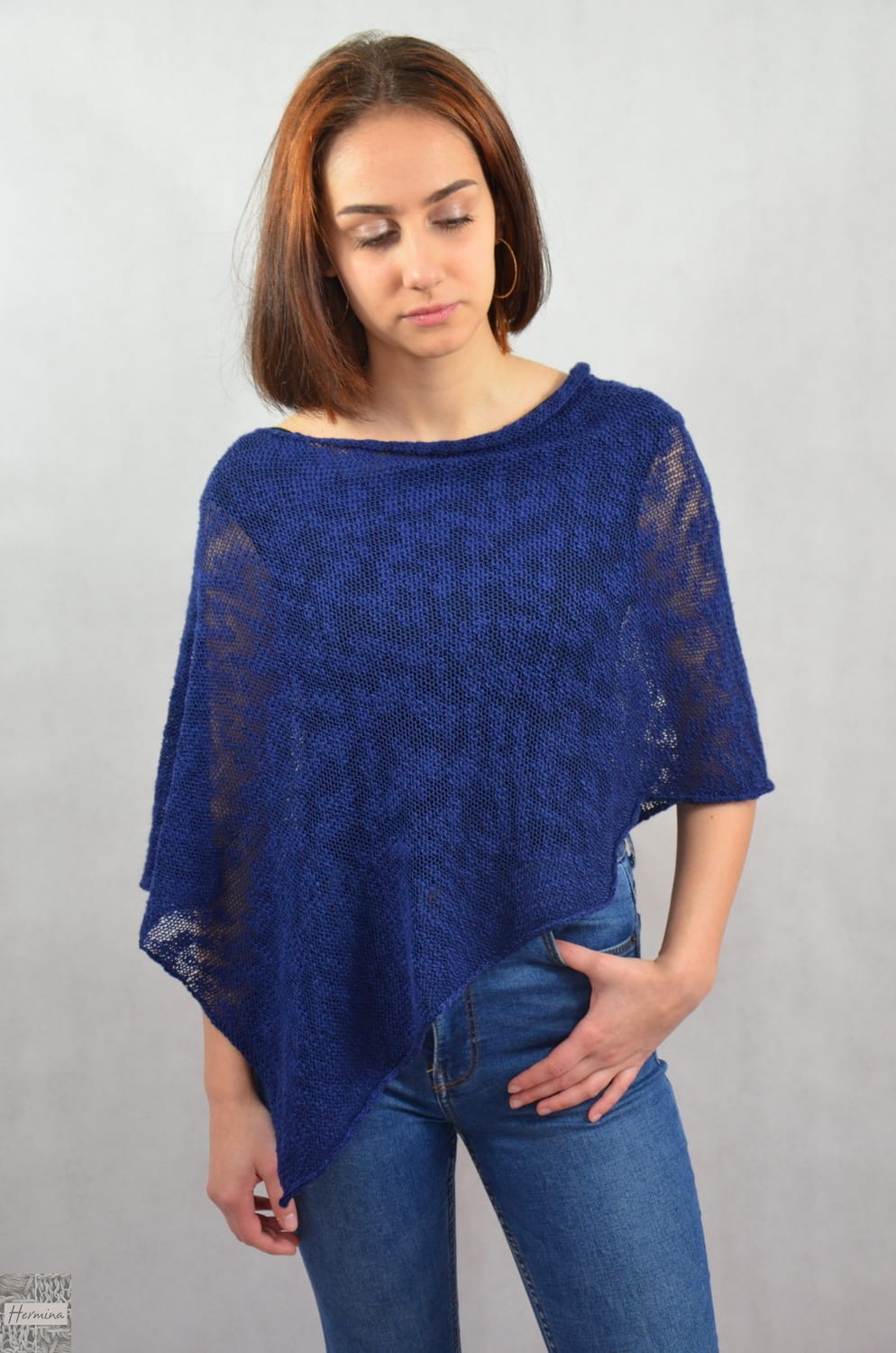 Ponczo wykonane z fantazyjnej nitki bawełnianej. Luźny, swobodny krój pasuje do każdej sylwetki, doskonale maskuje. Świetnie prezentuje się do sukienek bez rękawów i topów. Sprawdza się jako narzutka na letnie wieczory. Ponczo wykonane jest w naszej pracowni na ręcznej maszynie dziewiarskiej typu vintage, bez użycia prądu. Ponczo po rozłożeniu na płasko ma kształt prostokąta. Dostępne rozmiary: S/M szer.45 cm, dł.67 cm, L/XL szer.55cm dł. 77 cm. W naszym sklepie dostępne są również kolory: czerwony, zielony, beżowy i kremowy. Kolor na zdjęciu może się różnić ze względu na różne parametry monitora.