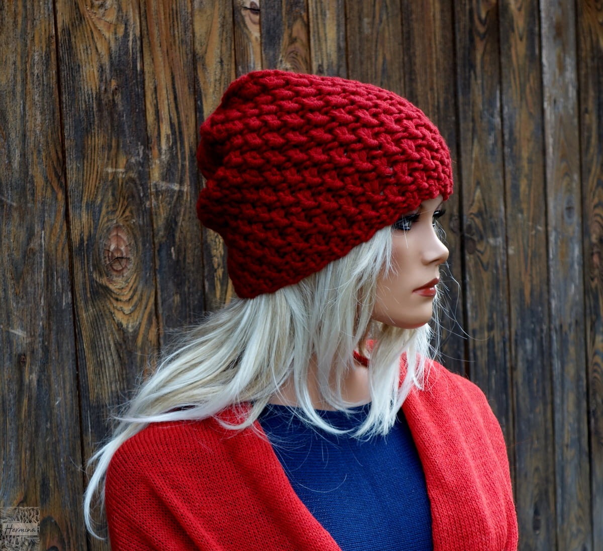 Ciepła czapka robiona na drutach ściegiem ryżowym.