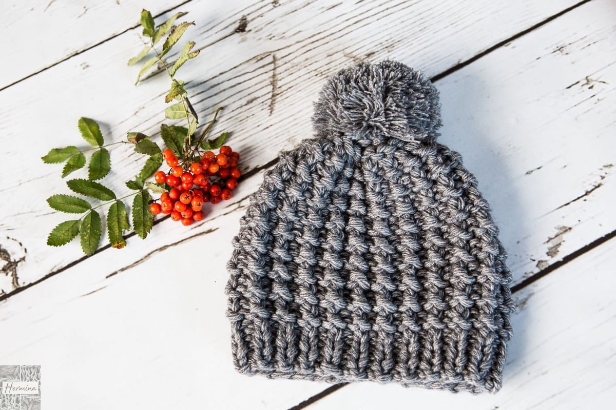 Ciepła czapka z pomponem robiona na drutach.