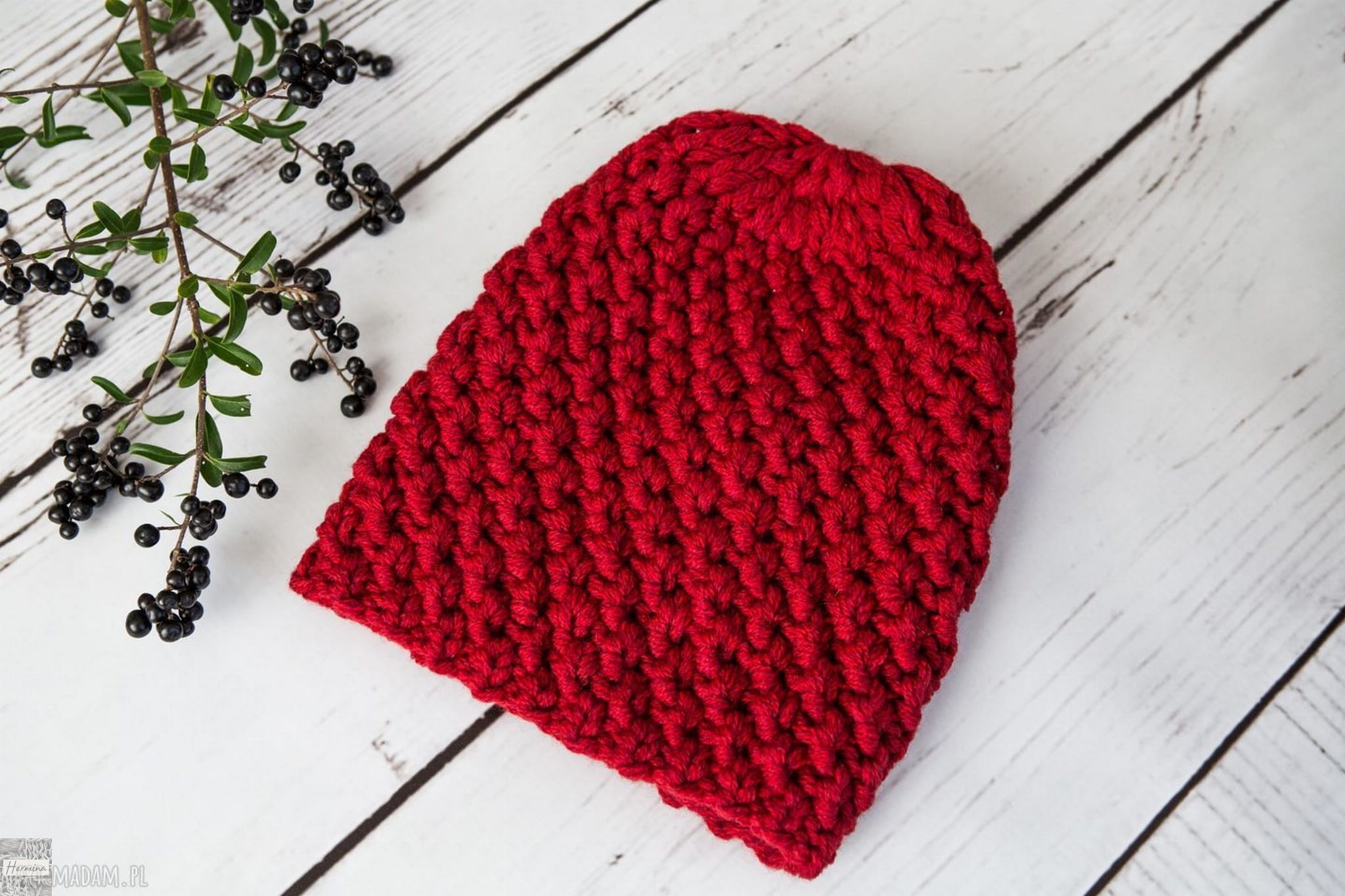Ciepła czapka robiona na drutach ściegiem ryżowym.