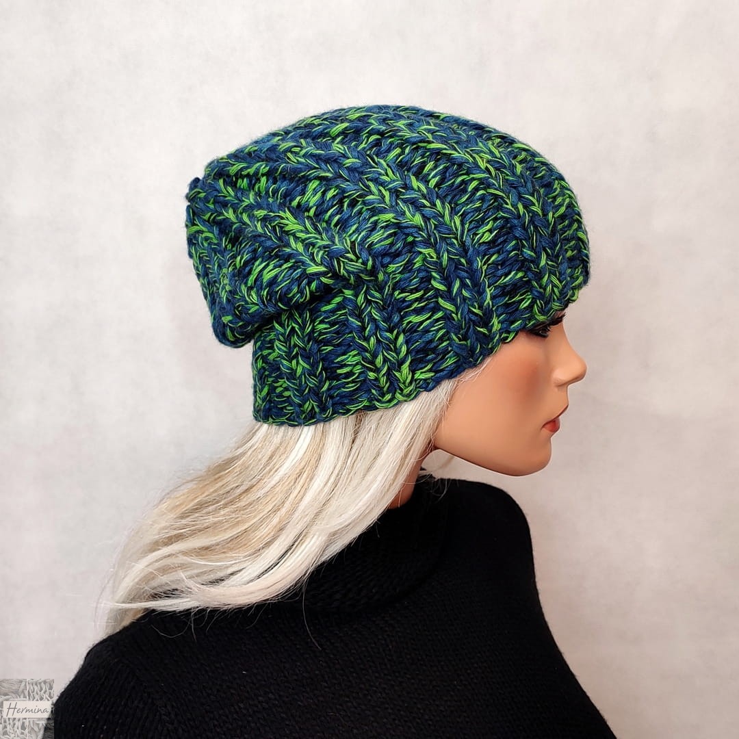 Czapka UNISEX wykonana ręcznie na drutach z włóczki w kolorach zieleni i jasnego granatu (melanż). Kolor na zdjęciu może się różnić ze względu na różne parametry monitora.