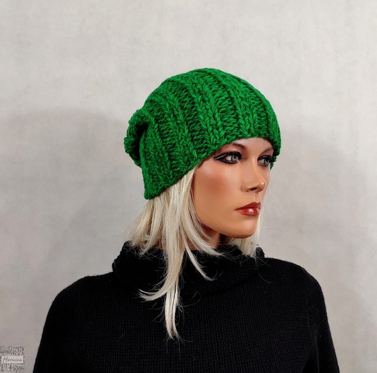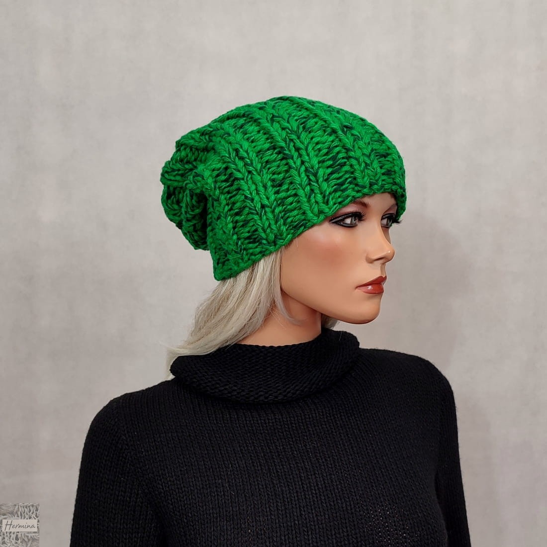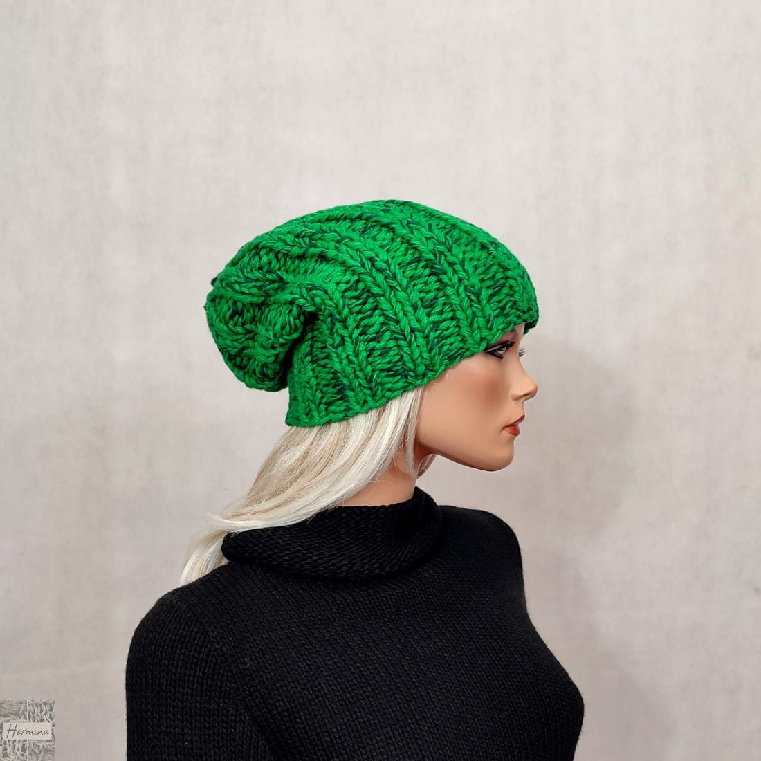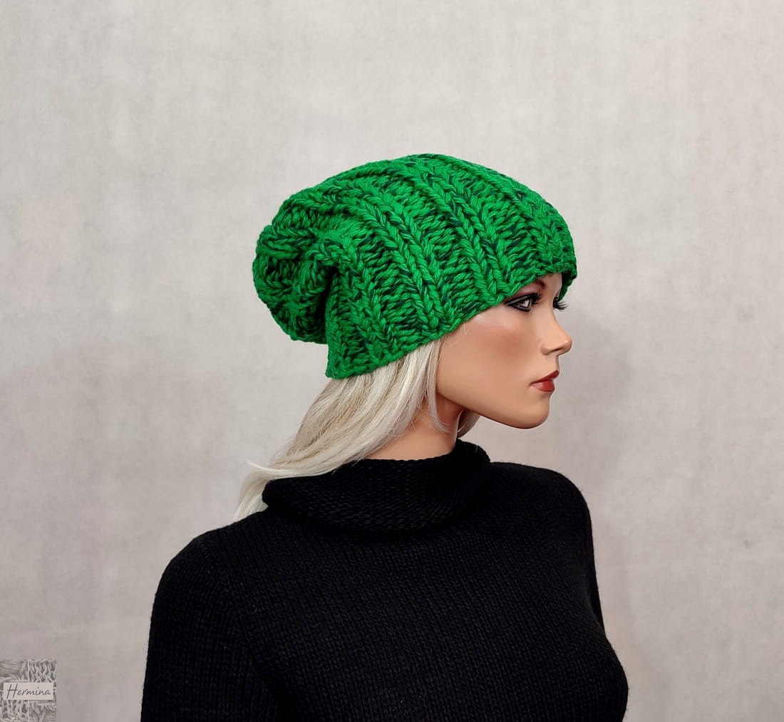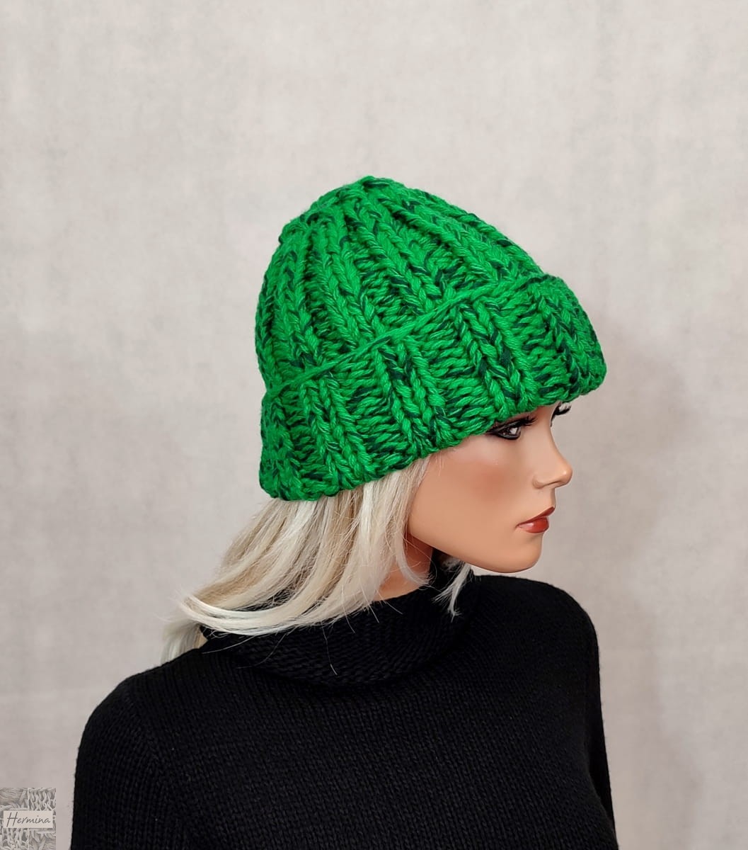 Czapka UNISEX wykonana ręcznie na drutach z włóczki w odcieniach zieleni (melanż).