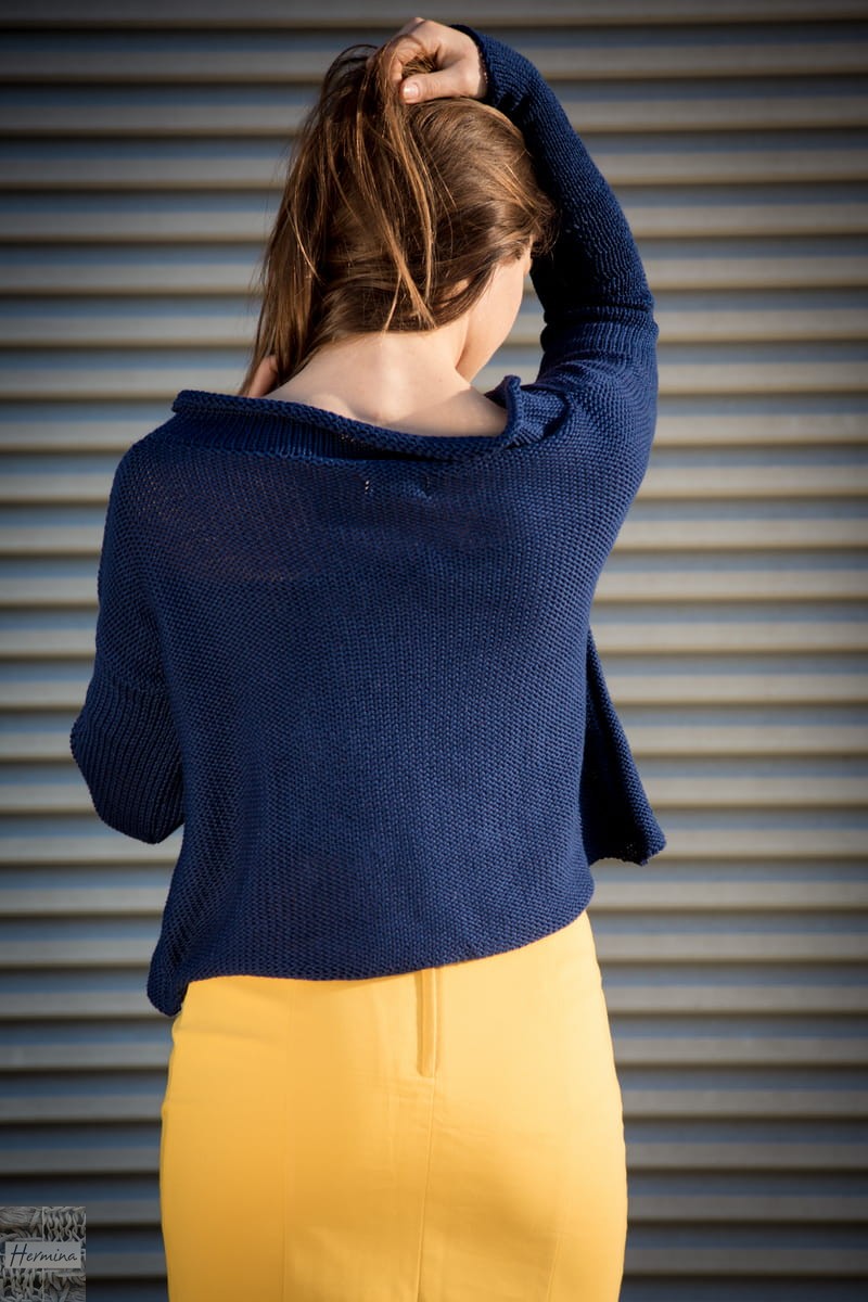 Bluzka z dzianiny o luźnym kroju wykonana z mieszanki bawełny z akrylem, w prostej formie z dekoltem w kształcie łódki wykończonym rulonikiem.
