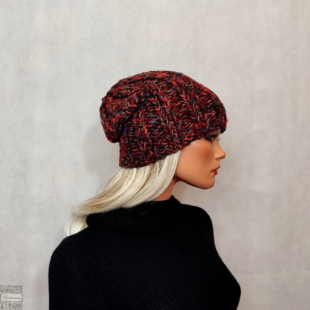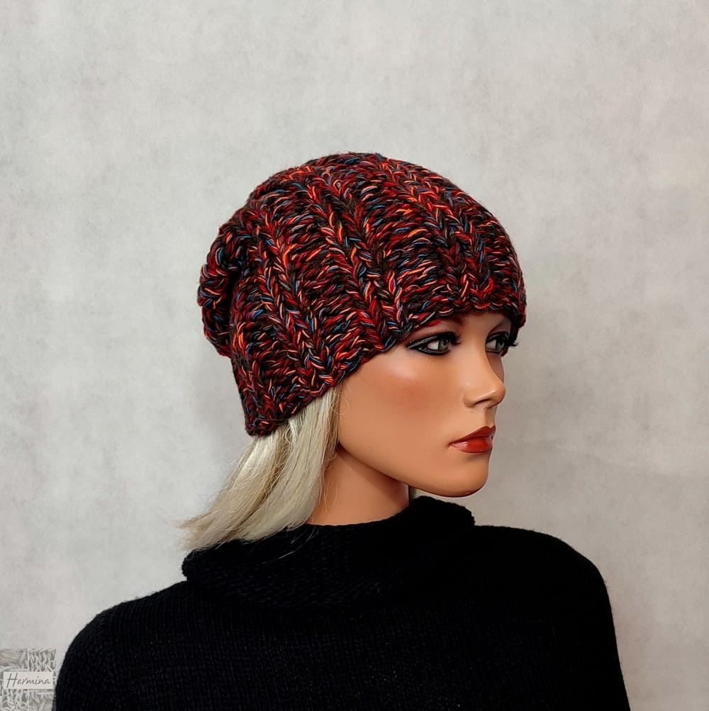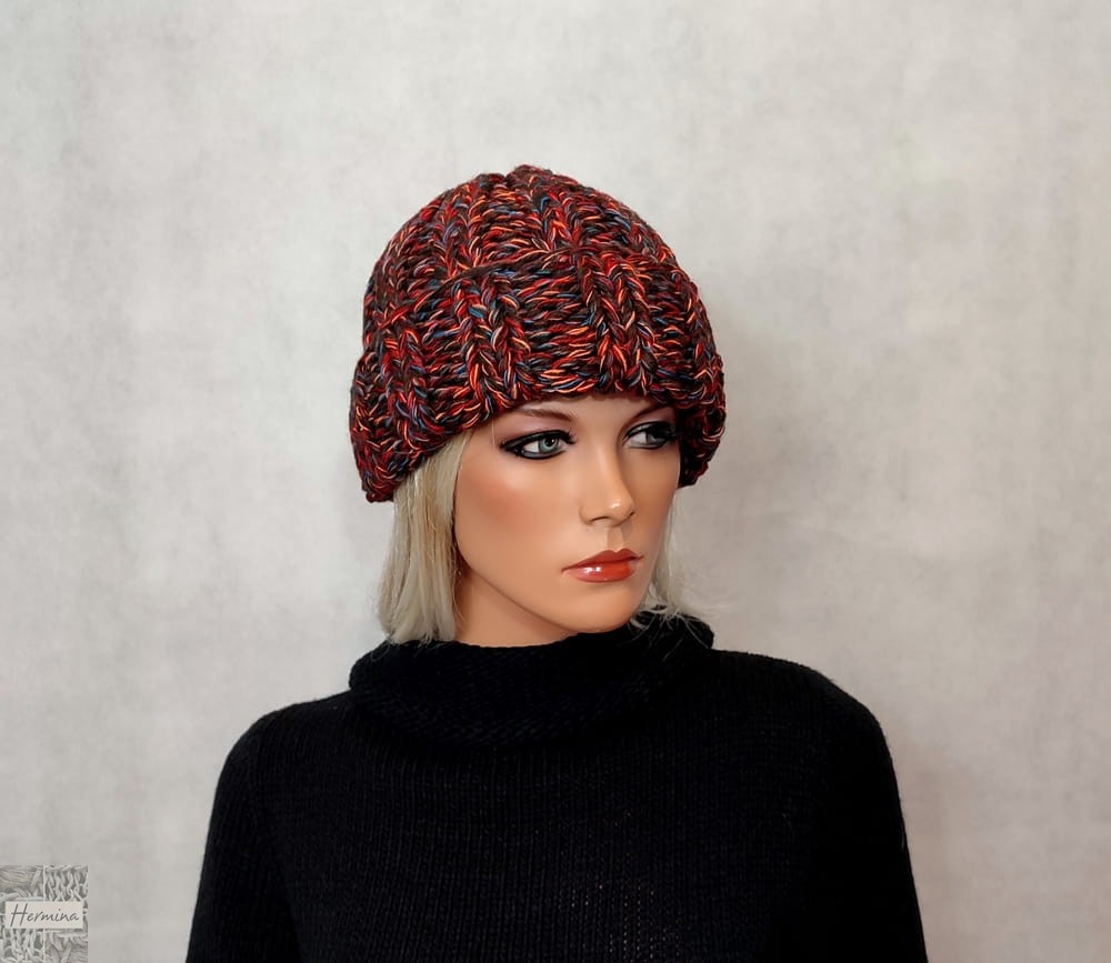 Czapka UNISEX wykonana ręcznie na drutach. Dominujące kolory włóczki to brązy z dodatkiem czerwieni, pomarańczu i turkusu. Kolor na zdjęciu może się różnić ze względu na różne parametry monitora.