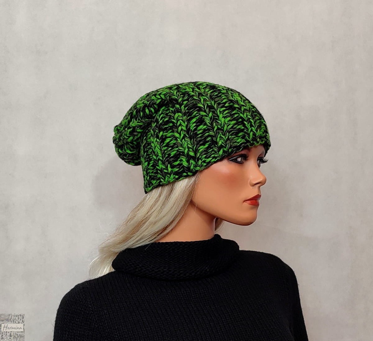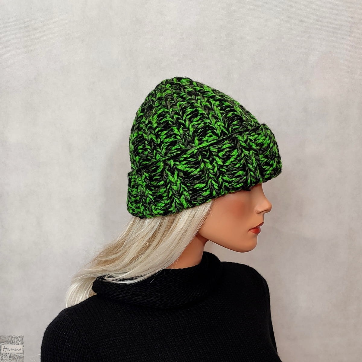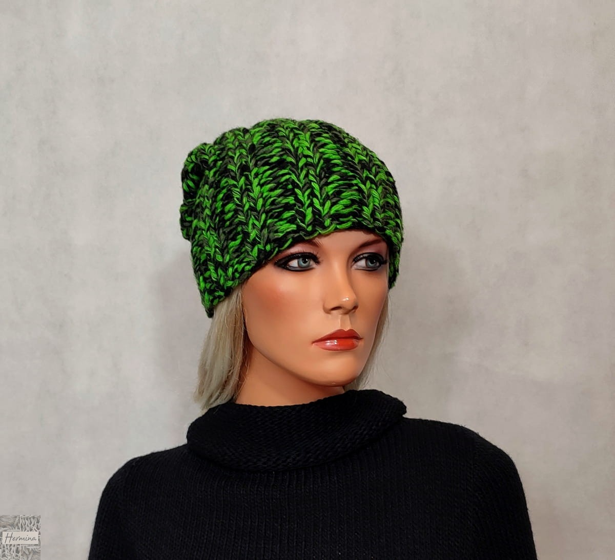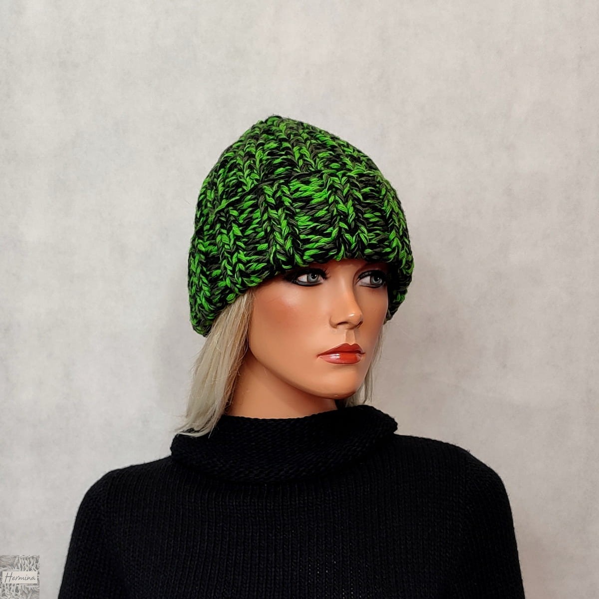 Czapka UNISEX wykonana ręcznie na drutach z włóczki w kolorze zielono - czarnym (melanż). Kolor na zdjęciu może się różnić ze względu na różne parametry monitora.