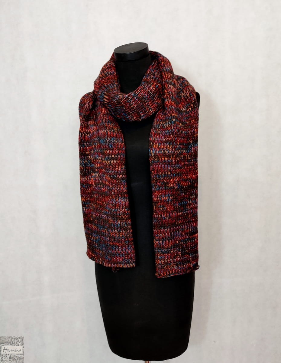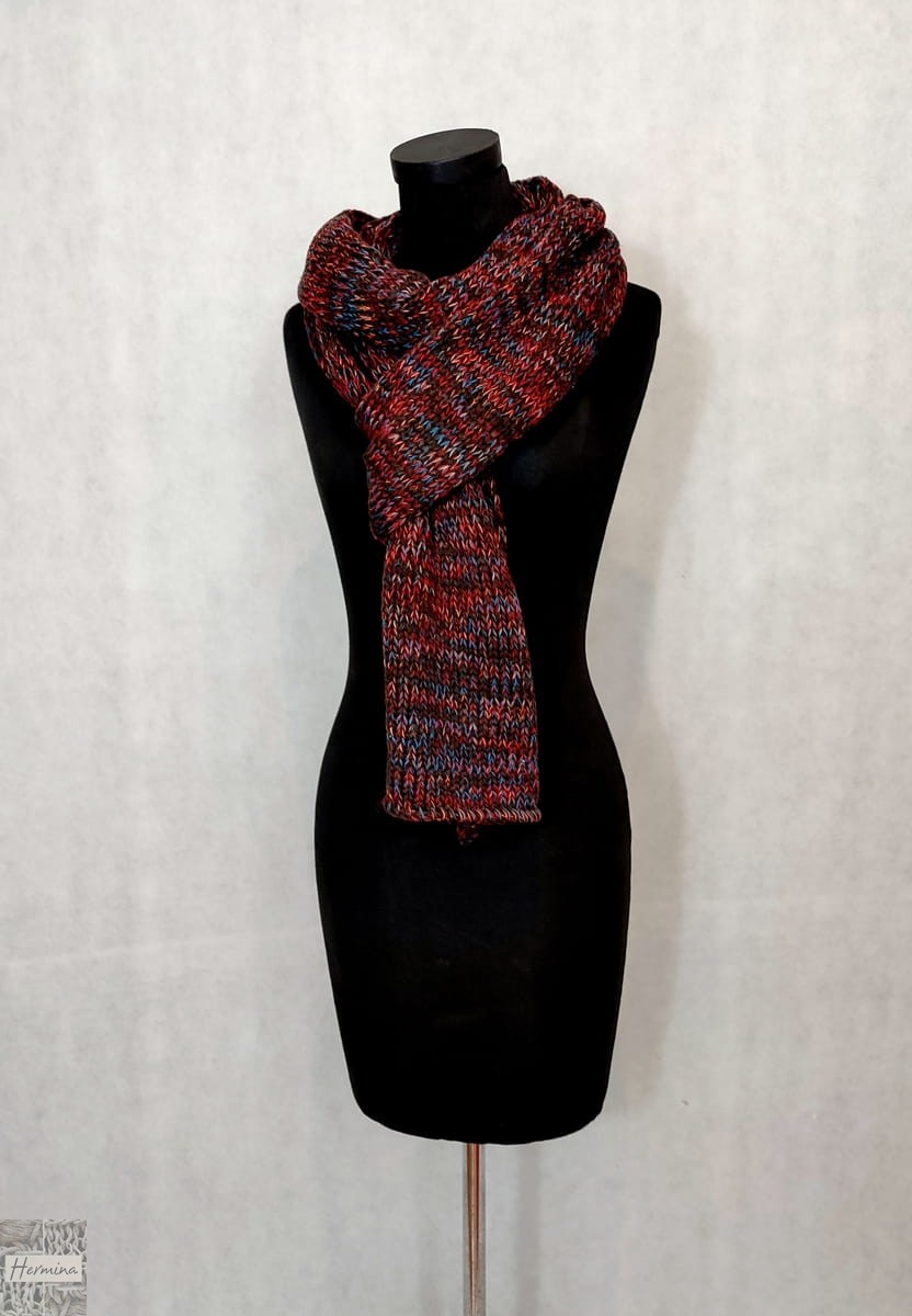 Szal UNISEX melanż na bazie brązu z dodatkiem czerwonego, pomarańczowego, turkusowego, który można doskonale łączyć z wieloma stylizacjami. Pasuje kobietom i mężczyznom. świetny także do stylizacji dla młodzieży.