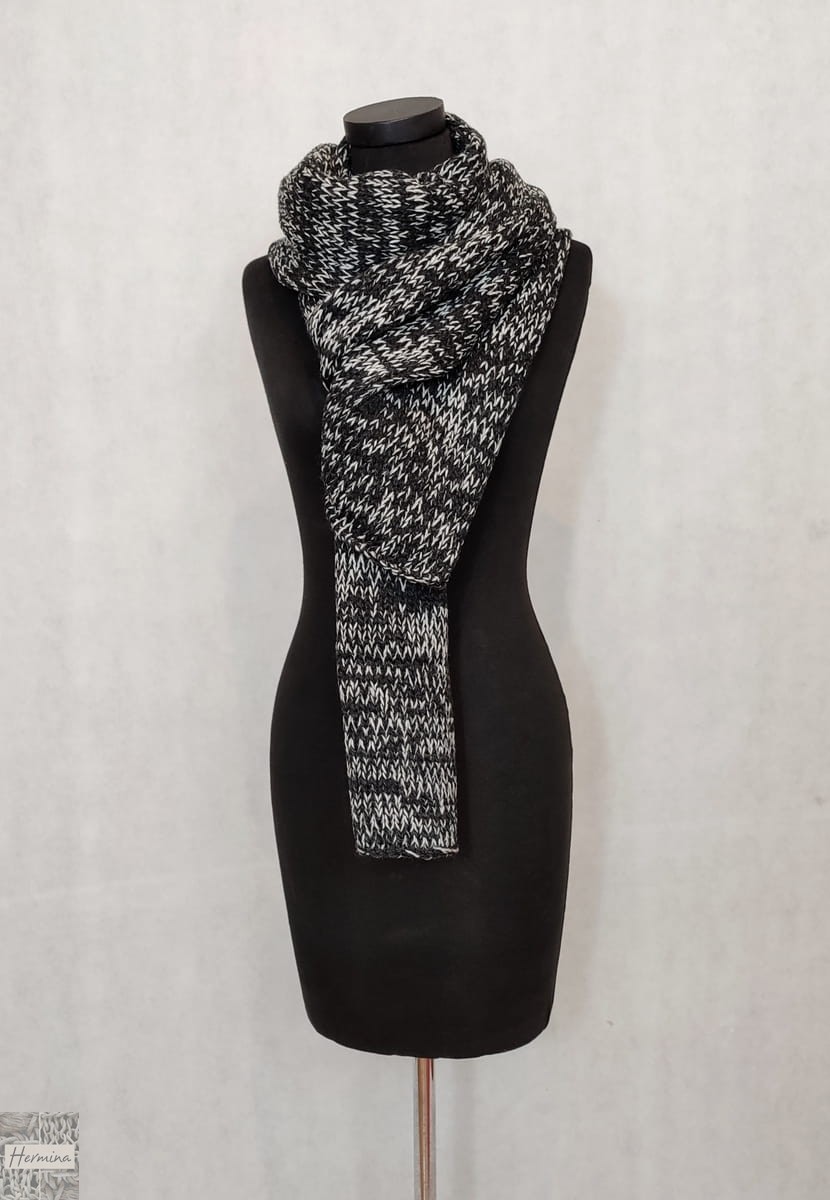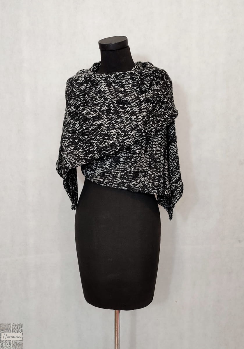 Ciepły, gruby szal UNISEX wykonany w naszej pracowni z wysokiej jakości wełny z merynosów z dodatkiem akrylu, w kolorze grafitowo-szarego melanżu.