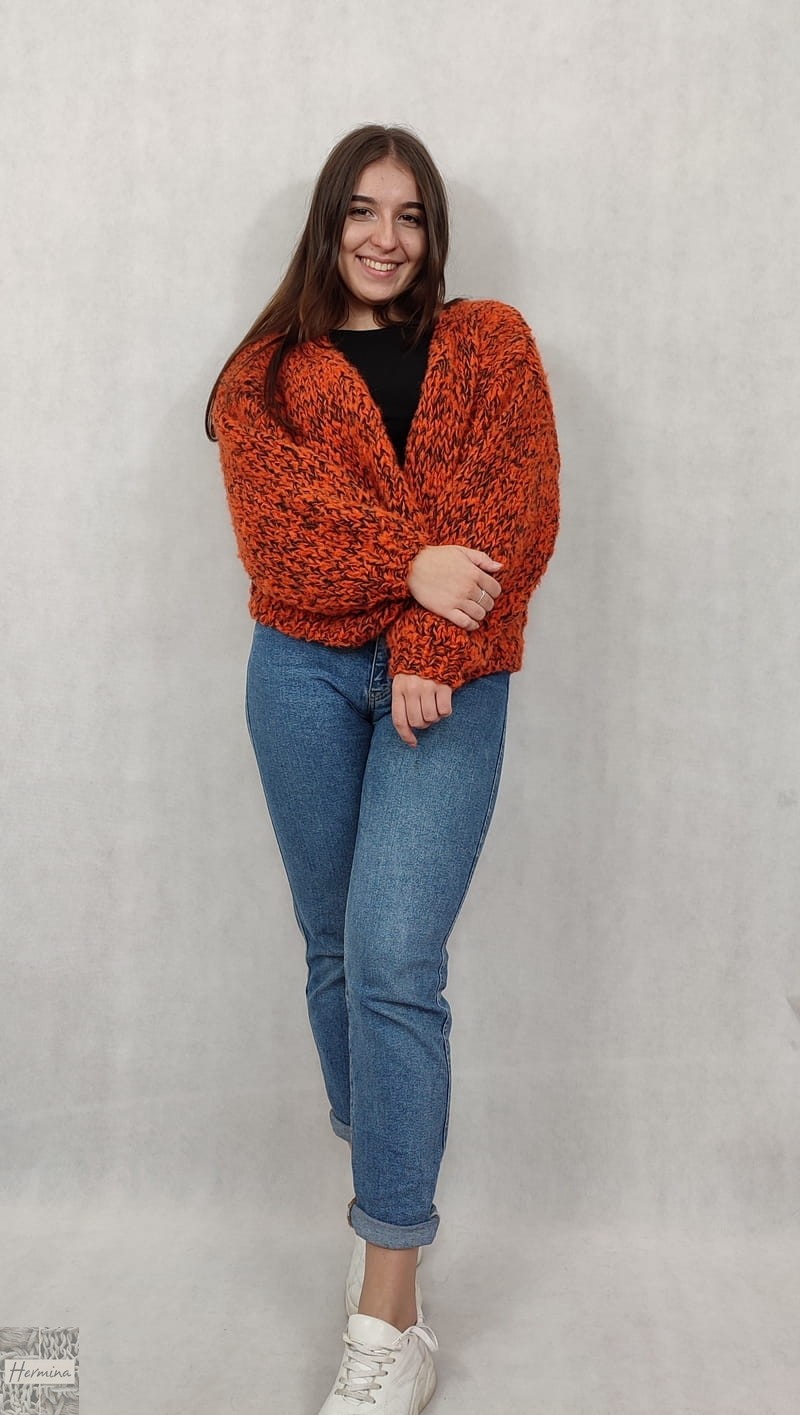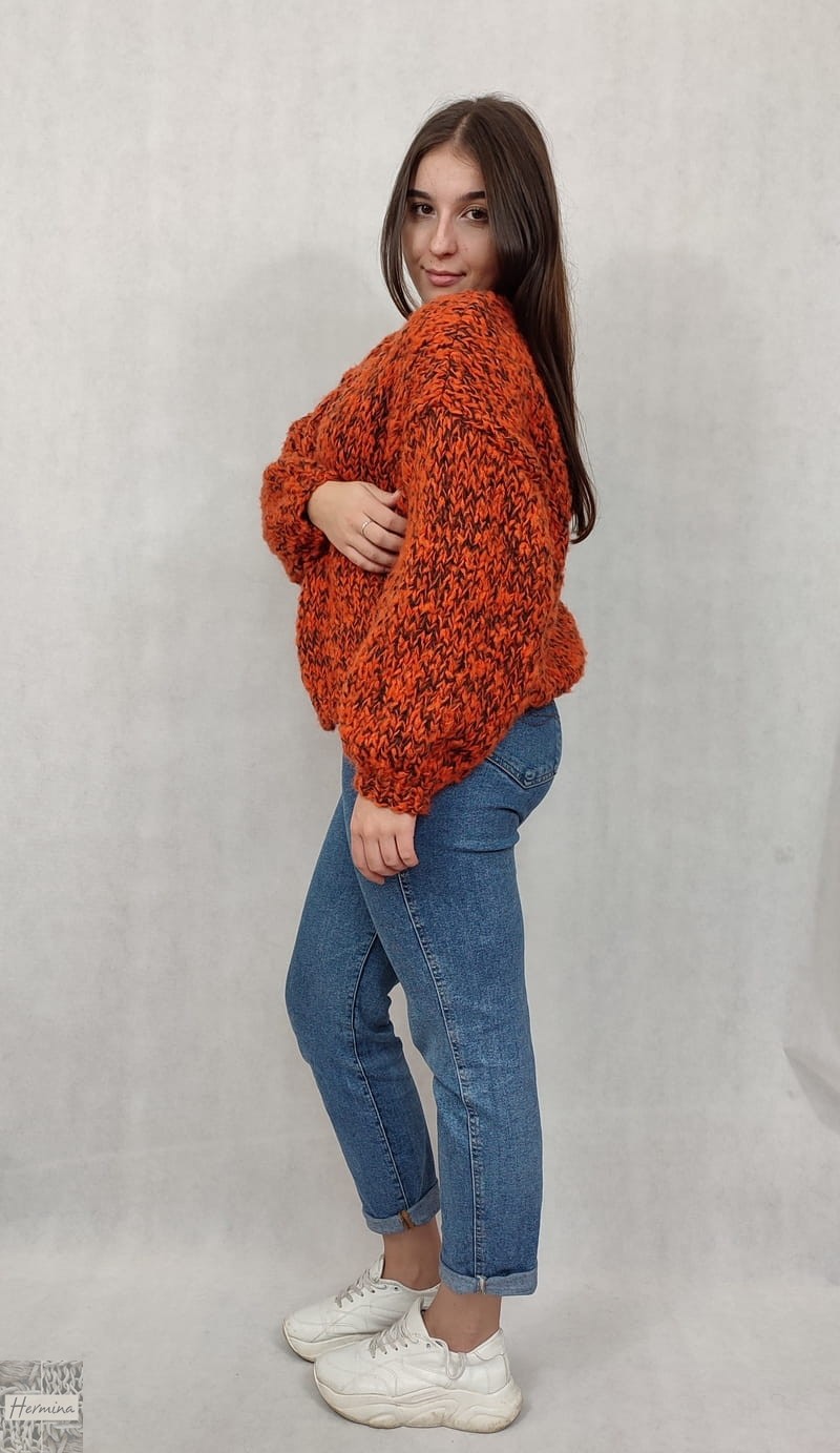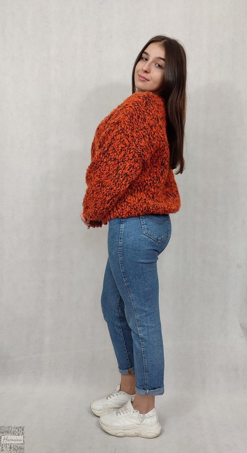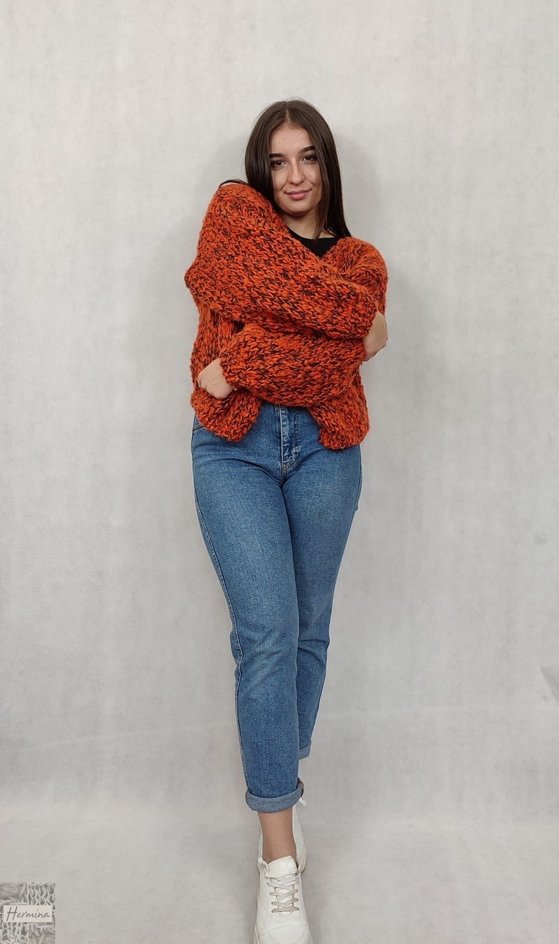 OVERSIZE ciepły, ręcznie robiony piękny, pomarańczowy kardigan wykonany z wełny i moheru. Sweter ma uniwersalną formę, jest starannie wykończony ściągaczem. Sweter zapinany jest na agrafkę, dzięki czemu można go odpowiednio dopasować.