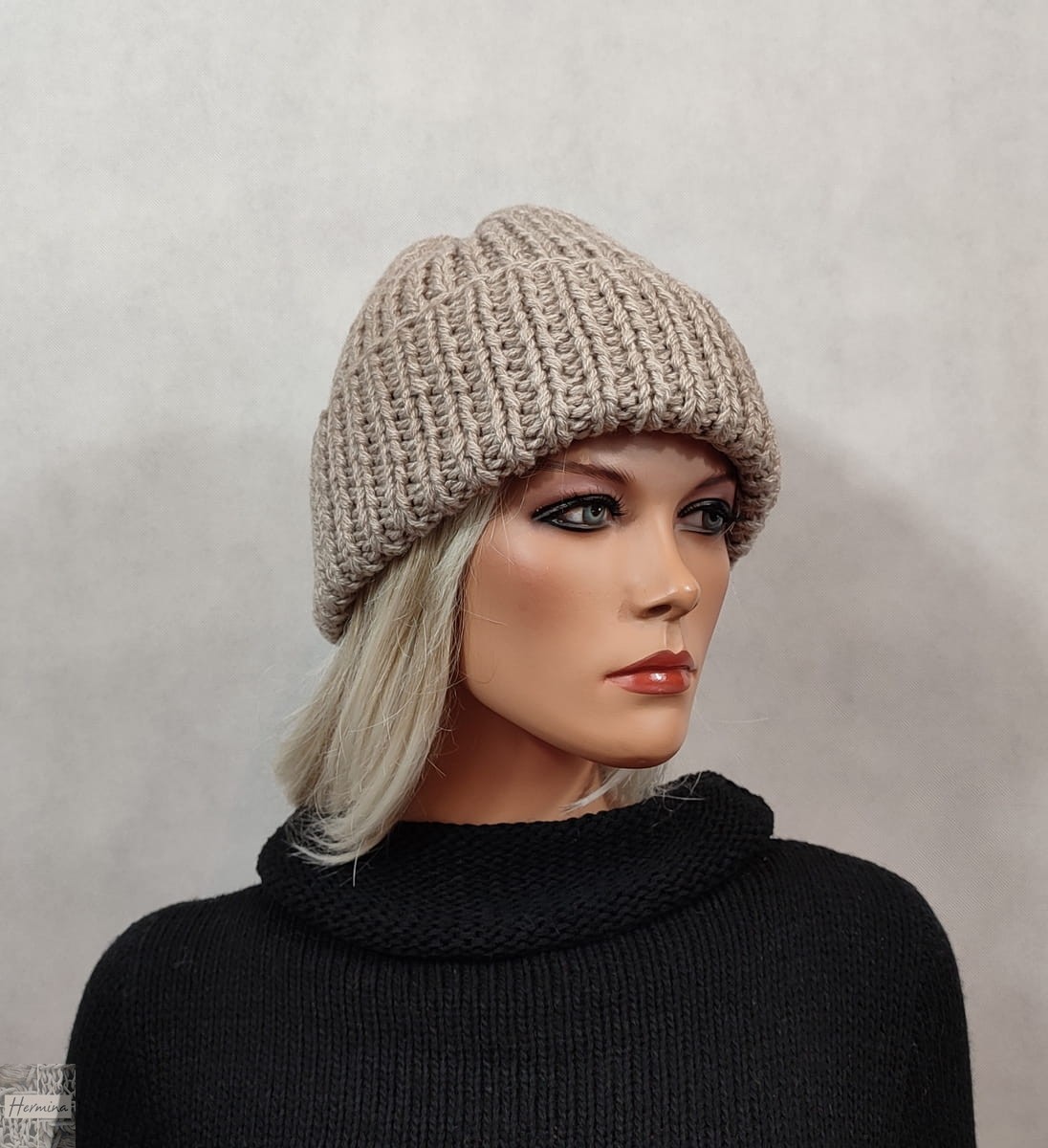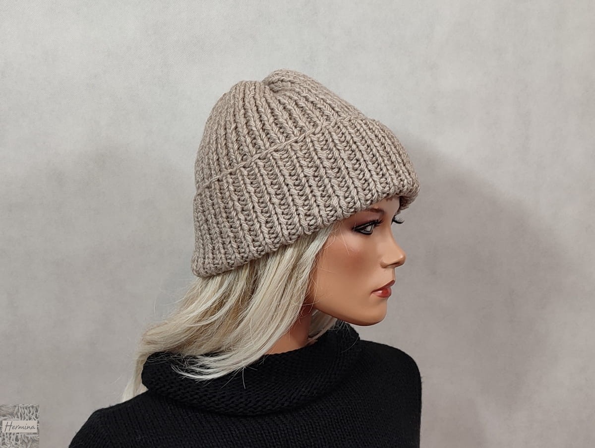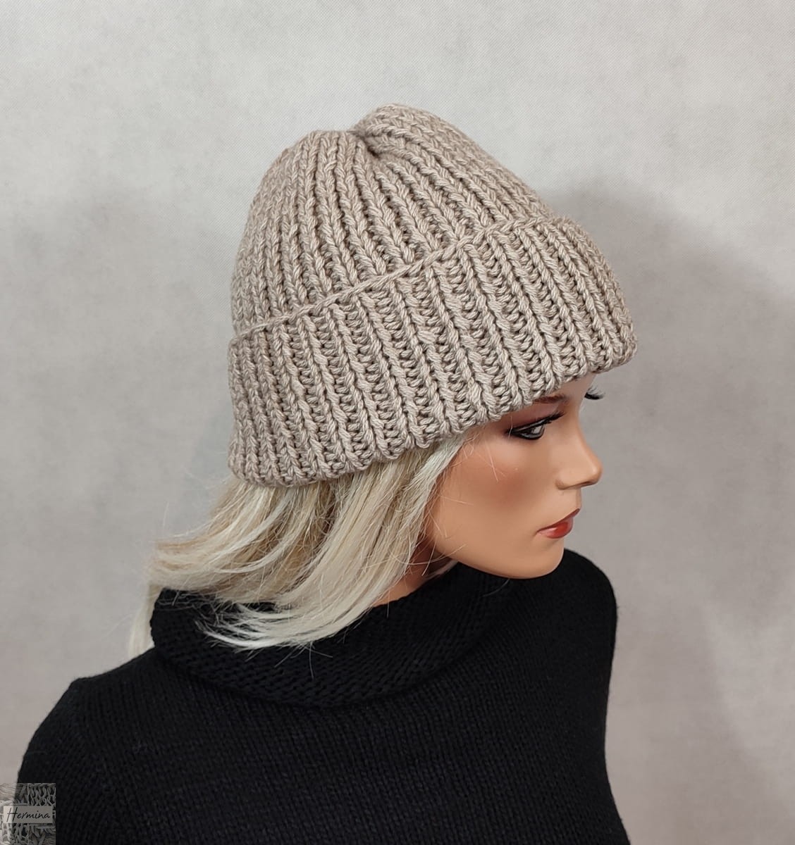 Czapka UNISEX wykonana ręcznie na drutach z włóczki w kolorze beżowym (melanż). Kolor na zdjęciu może się różnić ze względu na różne parametry monitora.