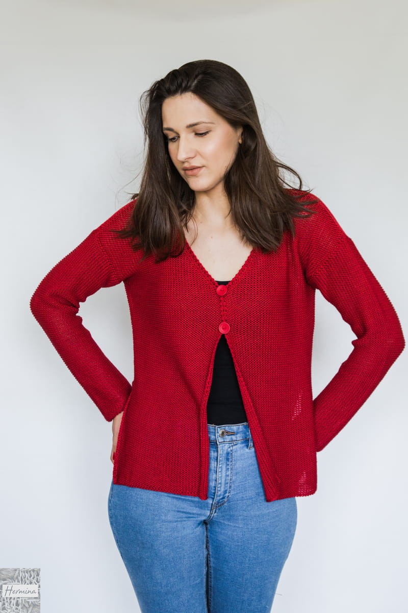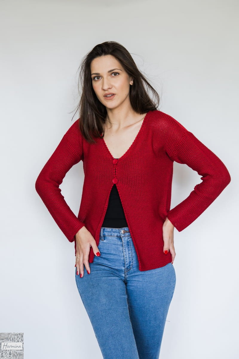 Minimalistyczny kardigan wykonany na ręcznej maszynie dziewiarskiej z mieszanki bawełny z akrylem.