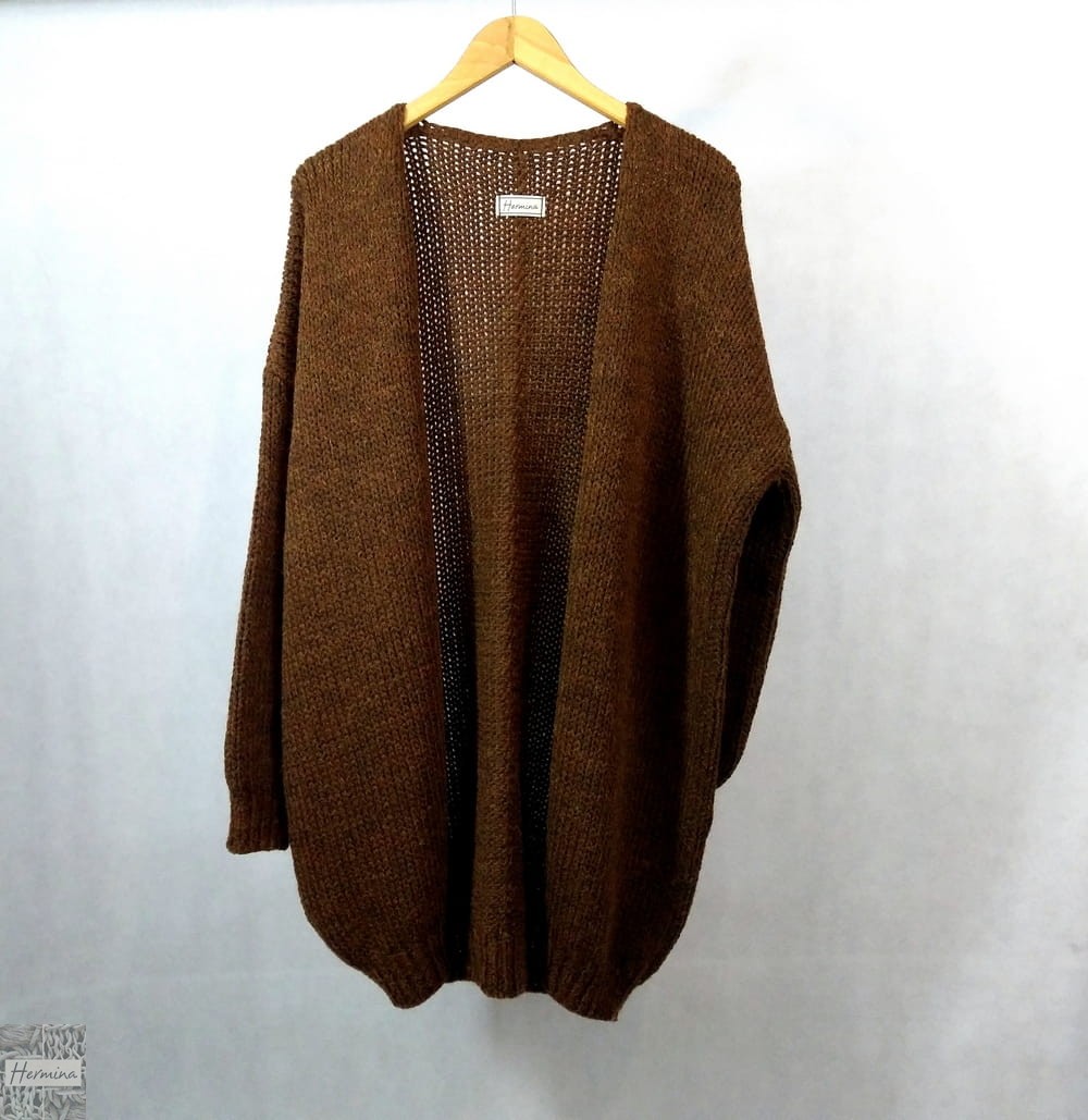 Ciepły, długi, oversizowy kardigan, wykonany w naszej pracowni z wysokiej jakości wełny z merynosów z alpaką i akrylem. Sweter jest miękki, ciepły i gruby, zapinany na dużą agrafkę.