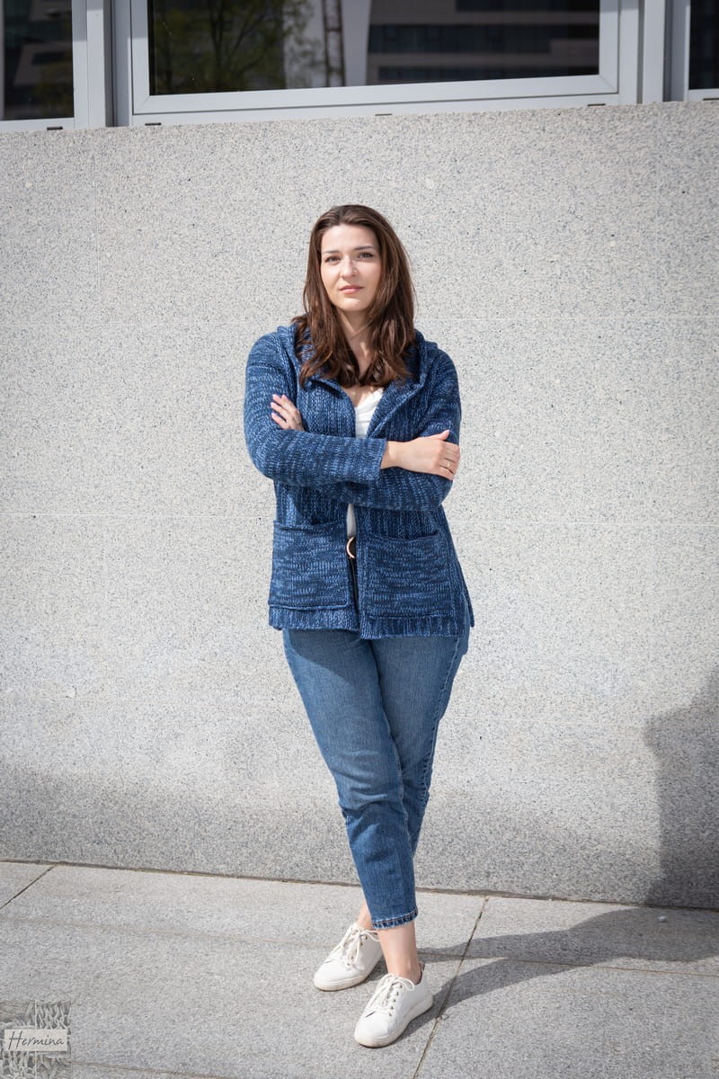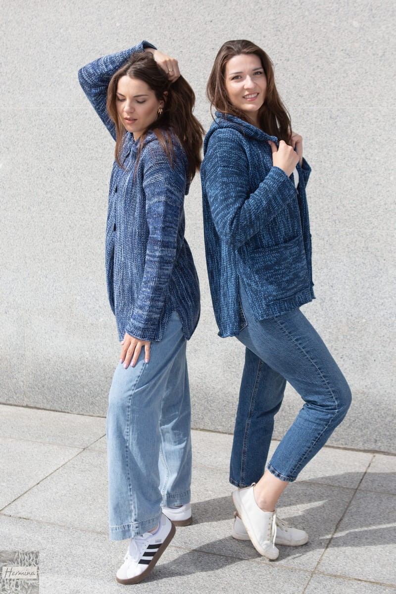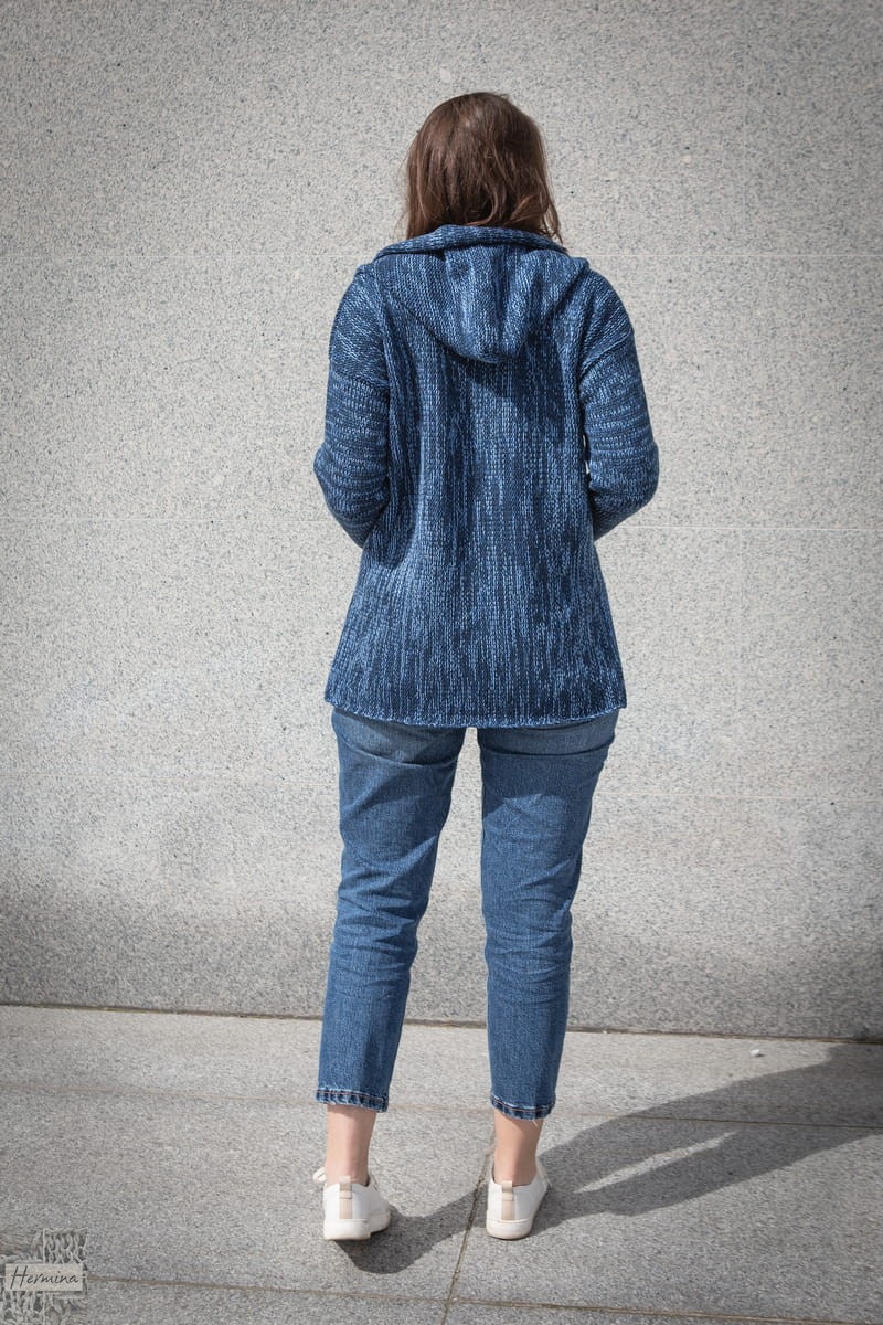 Kardigan wykonany z wysokiej jakości mieszanki wełny z akrylem, melanż w kolorze niebiesko-granatowym.