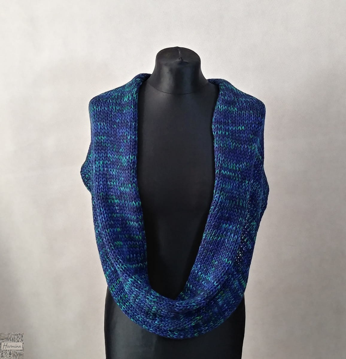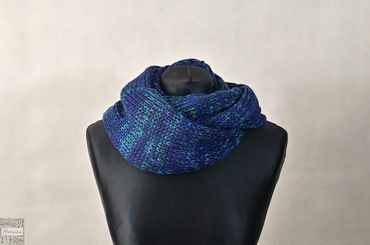 Prosty, melanżowy komin wykonany z wysokiej jakości włóczki, w odcieniach granatu, turkusu i szafiru. Pasuje do swetrów, płaszczy i kurtek. Ciepły i miły w dotyku.
