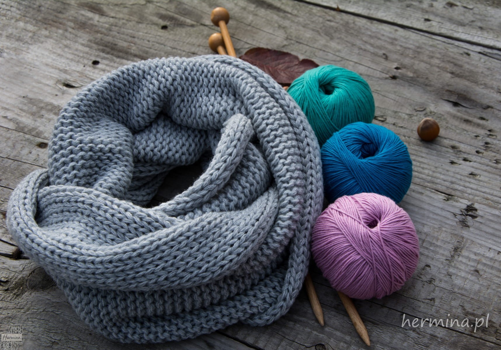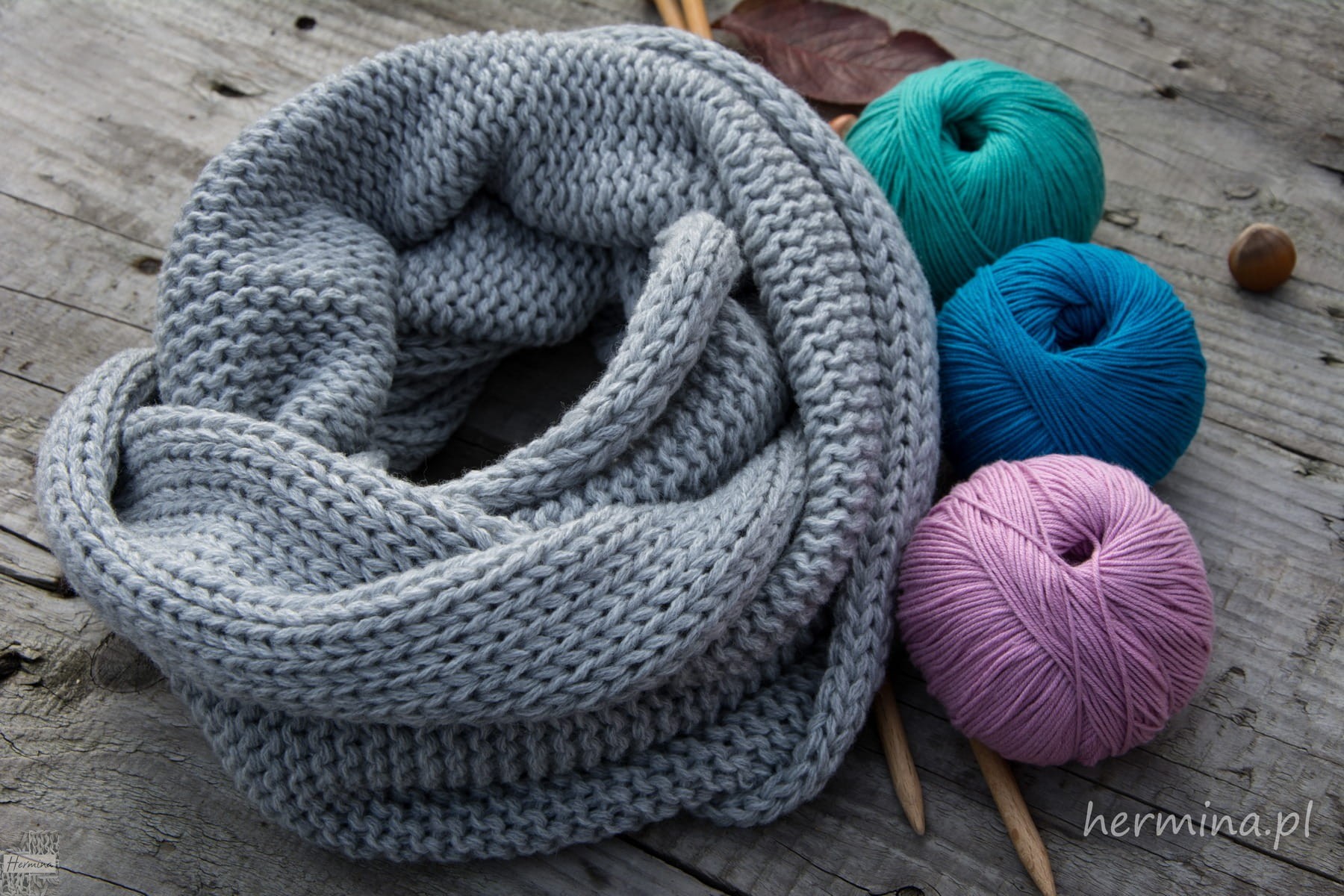 Ciepły szary komin wykonany z wysokiej jakości włóczki. Można nosić go z wieloma kolorami, ciepły dobrze przylega do szyi a jednocześnie nie uciska, miękki i miły w dotyku. Istnieje możliwość dokupienia czapki w takiej samej kolorystyce lub mitenek.