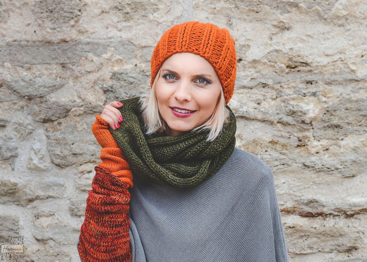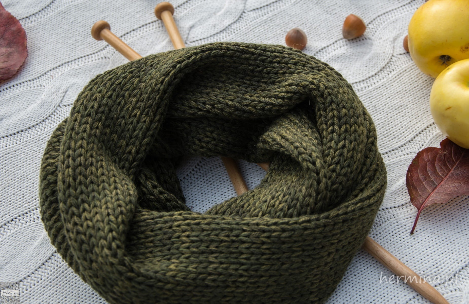 Prosty, ciepły komin wykonany z wysokiej jakości włóczki w kolorze militarnej zieleni. Można nosić go z wieloma kolorami, ciepły dobrze przylega do szyi a jednocześnie nie uciska, miękki i miły w dotyku. Istnieje możliwość dokupienia czapki w takiej samej kolorystyce lub mitenek. Projekt i wykonanie: HERMINA Wymiary: -obwód ok. 120 cm -wysokość ok. 35 cm skład: wełna 50%/akryl 50% Prać w letniej wodzie z płynem, suszyć na płasko