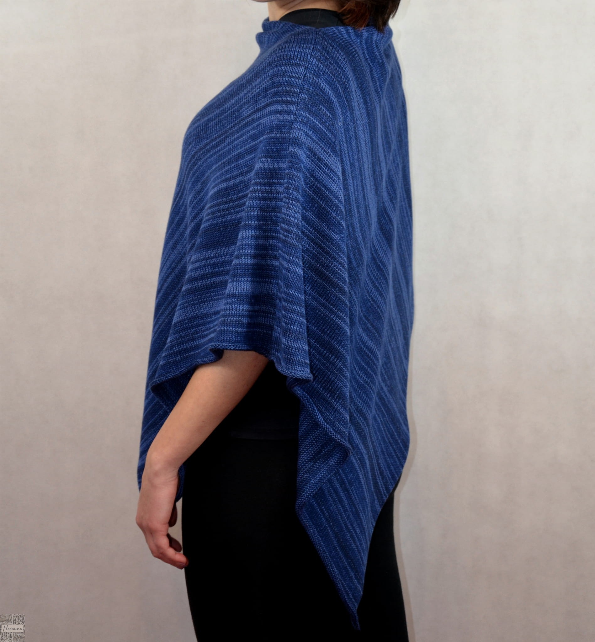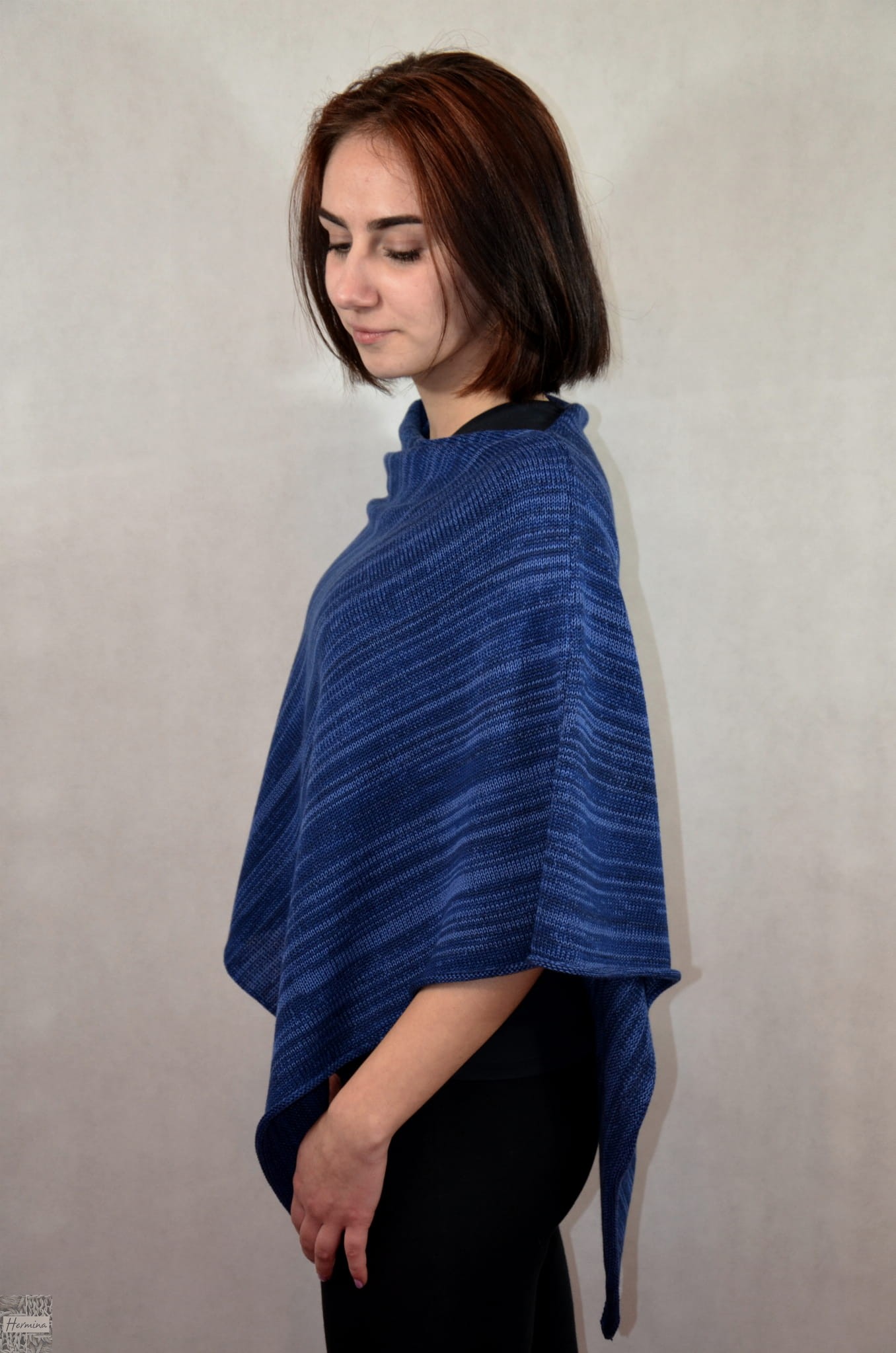 Ponczo wykonane z bawełny z akrylem. Pasuje do wielu stylizacji.Luźny, swobodny krój pasuje do każdej sylwetki. Dostępne w kolorze: melanż szafirowy. Wykonane na ręcznej maszynie dziewiarskiej typu vintage. Kolor na zdjęciu może się różnić ze względu na różne parametry monitora. Dostępne w rozmiarze S/M, L/ XL