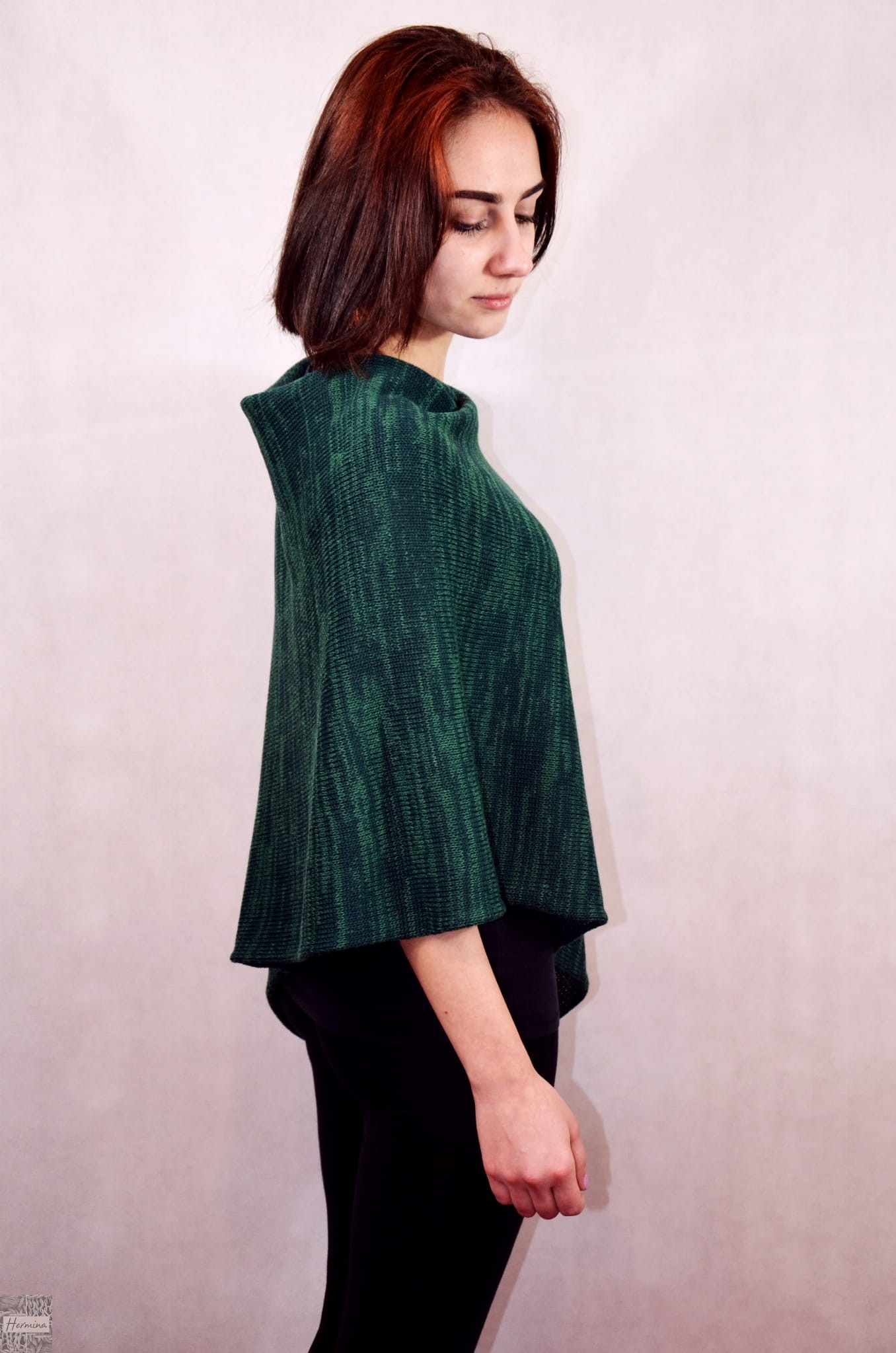 Ponczo wykonane z wełny z akrylem. Idealne na przejściowe pory roku. Luźny, swobodny krój pasuje do każdej sylwetki. Dostępne w kolorze melanżu butelkowej zieleni. Dzianina jest miękka i sprężysta, dlatego łatwo dopasowuje się do sylwetki. Wykonane na ręcznej maszynie dziewiarskiej typu vintage. Kolor na zdjęciu może się różnić ze względu na różne parametry monitora. Dostępne w rozmiarze S/M, L/ XL
