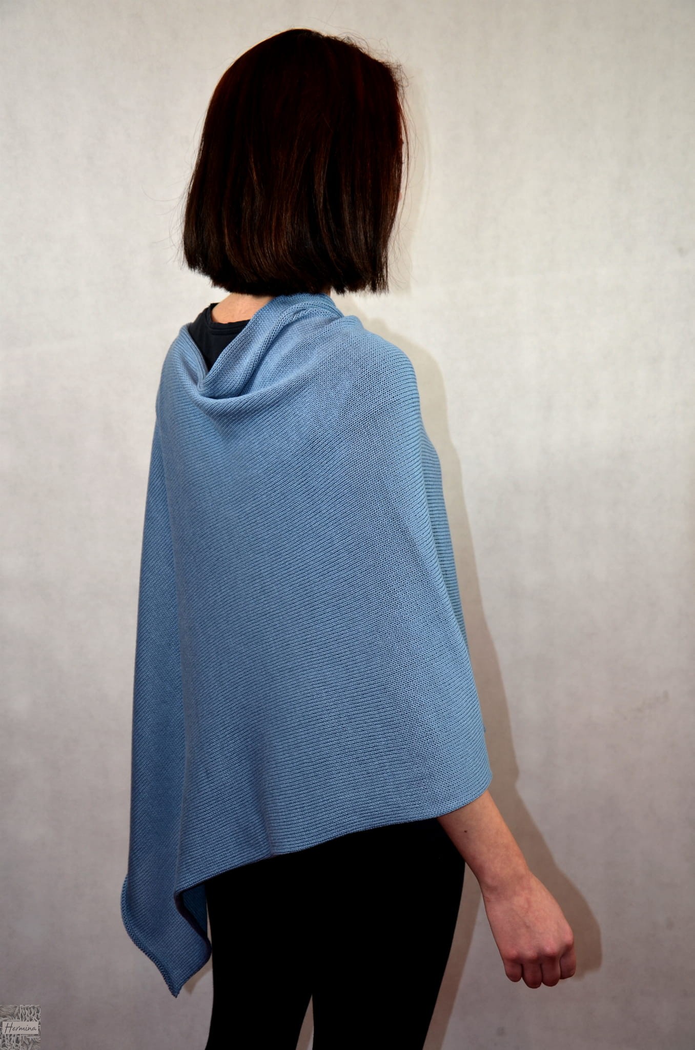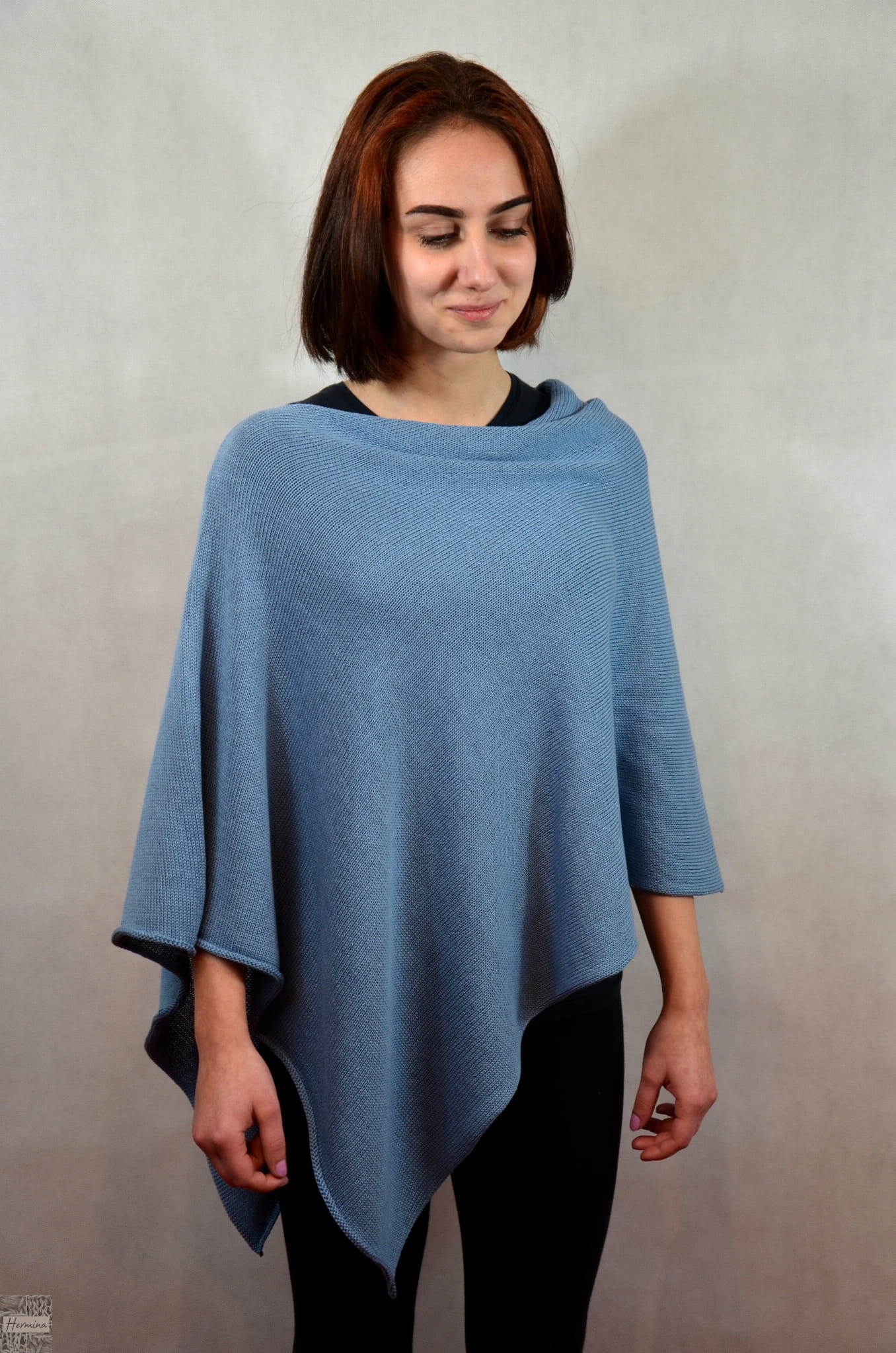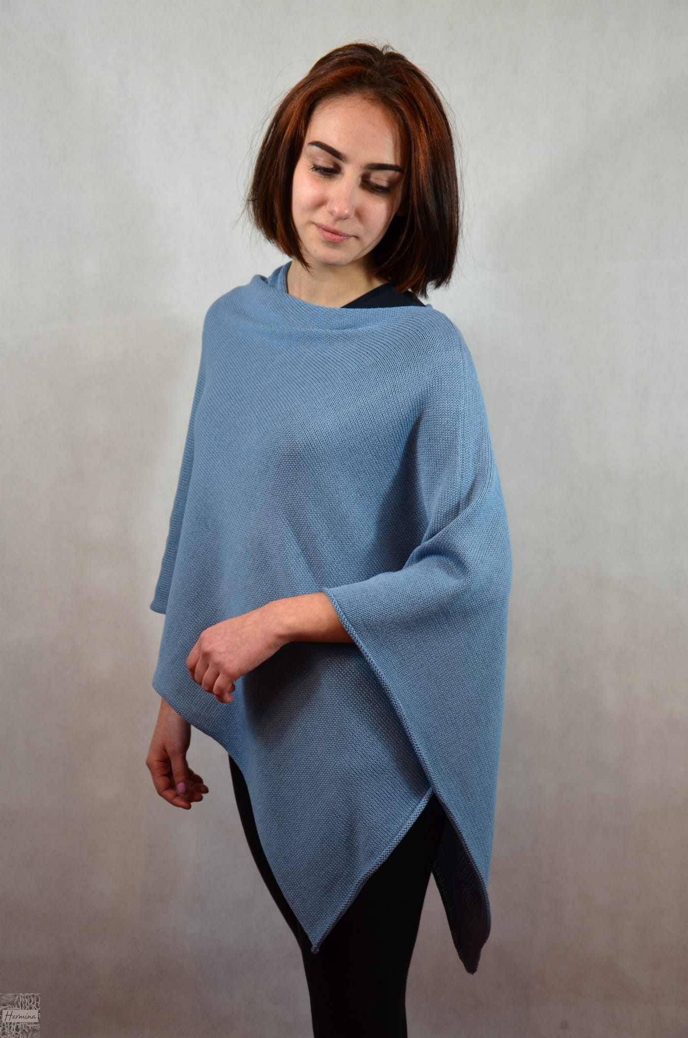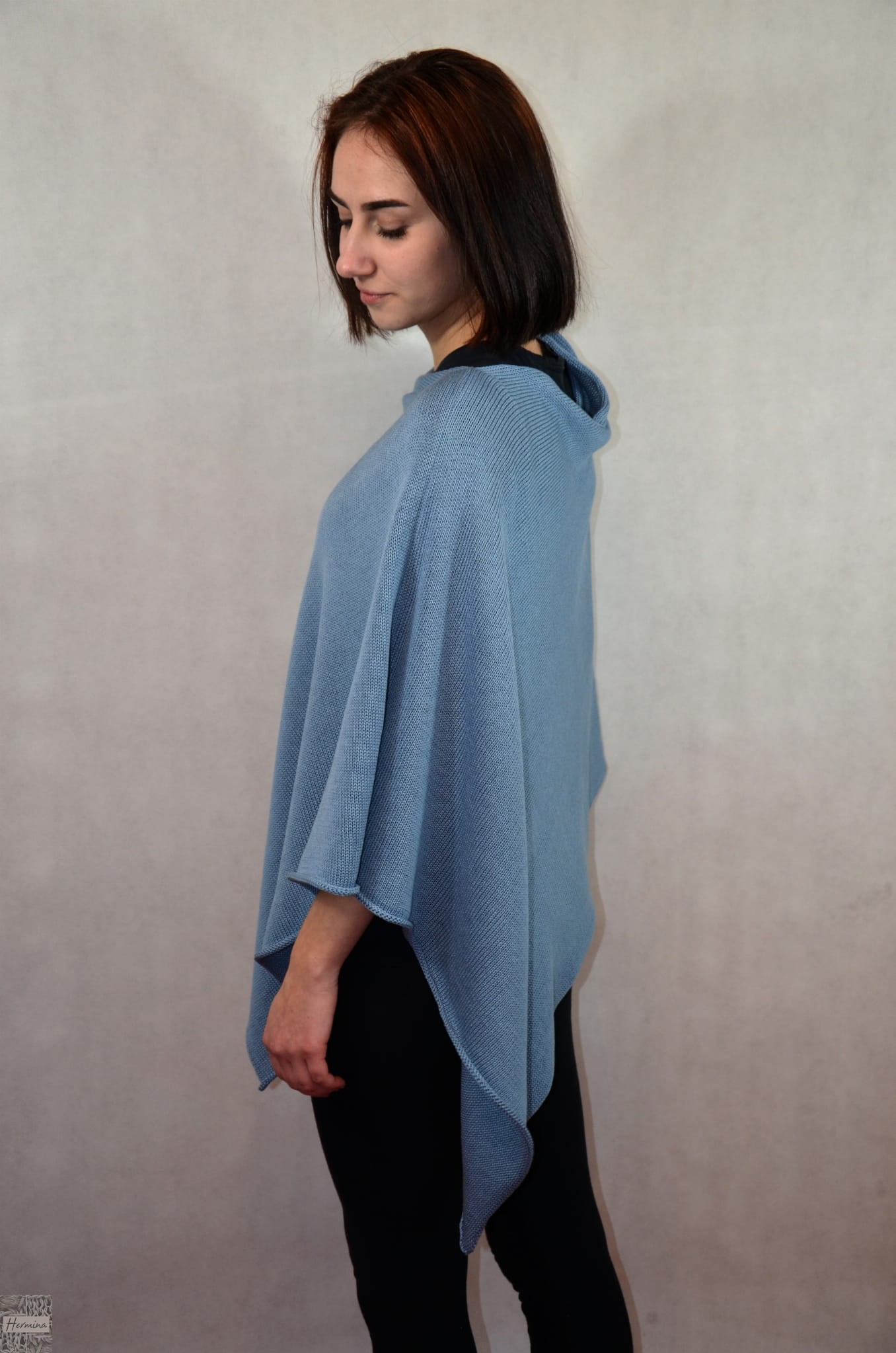 Ponczo niebieskie wykonana z bawełny z akrylem. Luźny, swobodny krój pasuje do każdej sylwetki. Dzianina wykonana na ręcznej maszynie dziewiarskiej typu vintage. Kolor na zdjęciu może się różnić ze względu na różne parametry monitora. Wygodne i praktyczne idealne na każdą porę roku. Dostępne w rozmiarze S/M, L/ XL