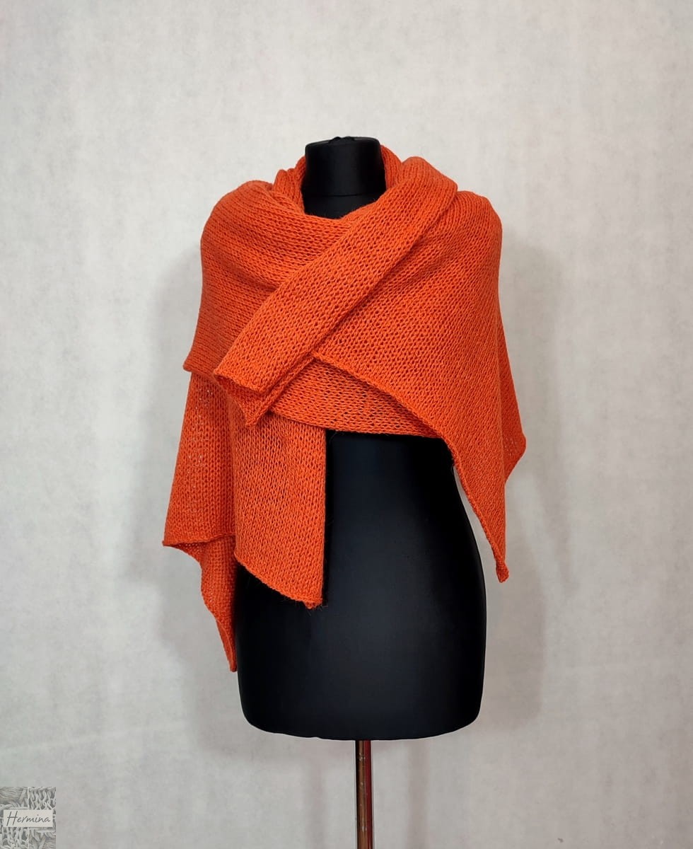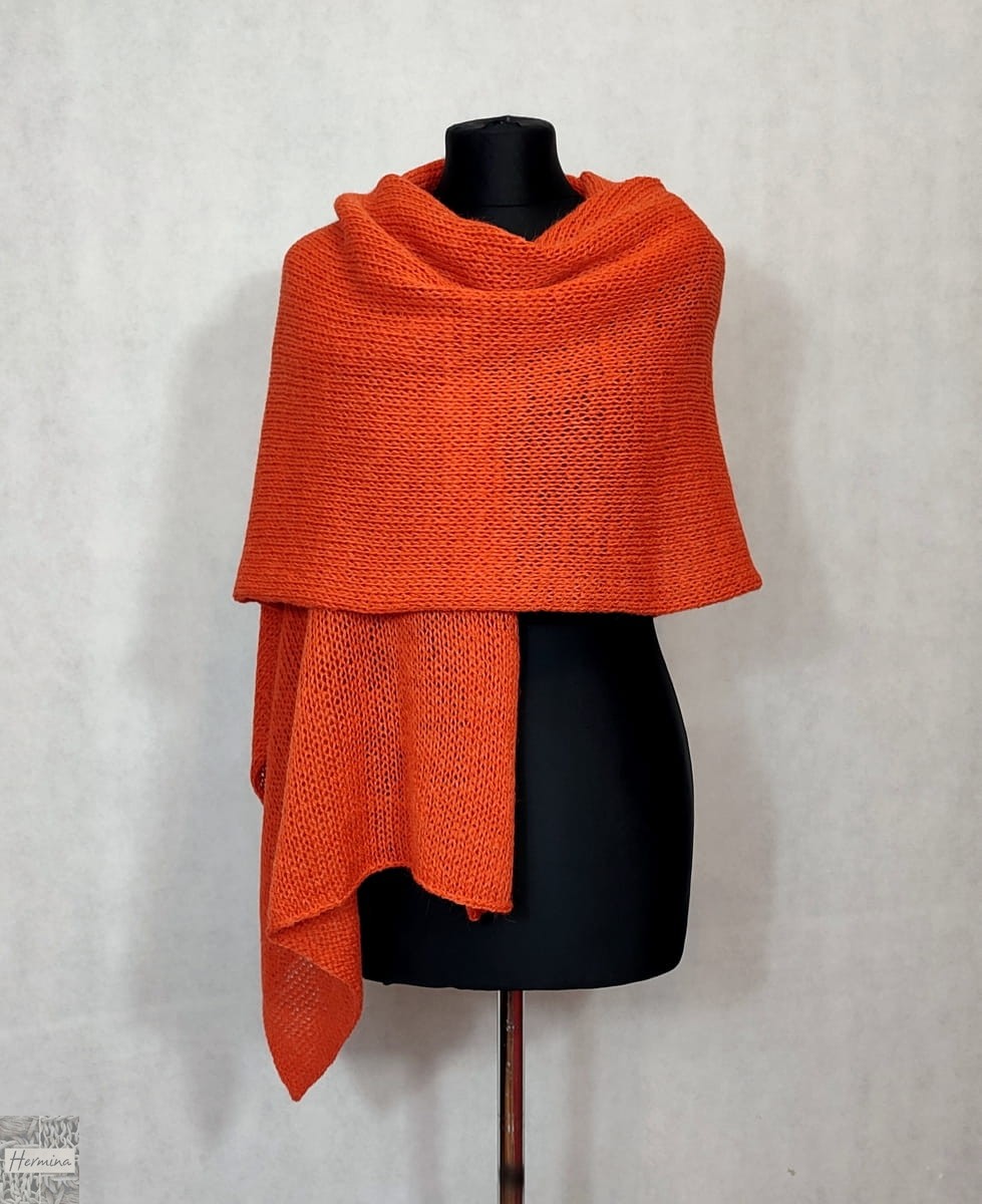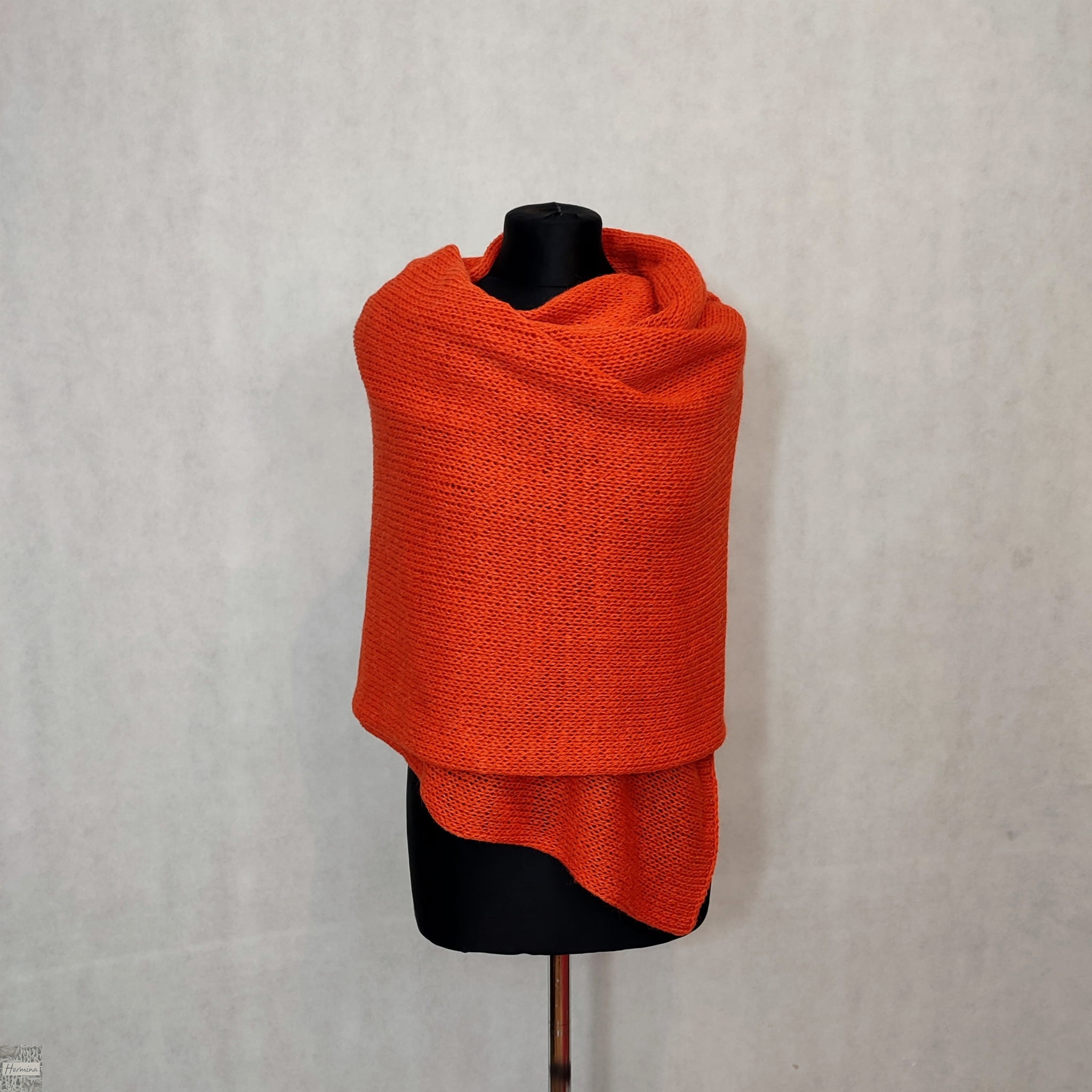 Prezentujemy ciepły, obszerny, miękki szal w kolorze pomarańczowym.