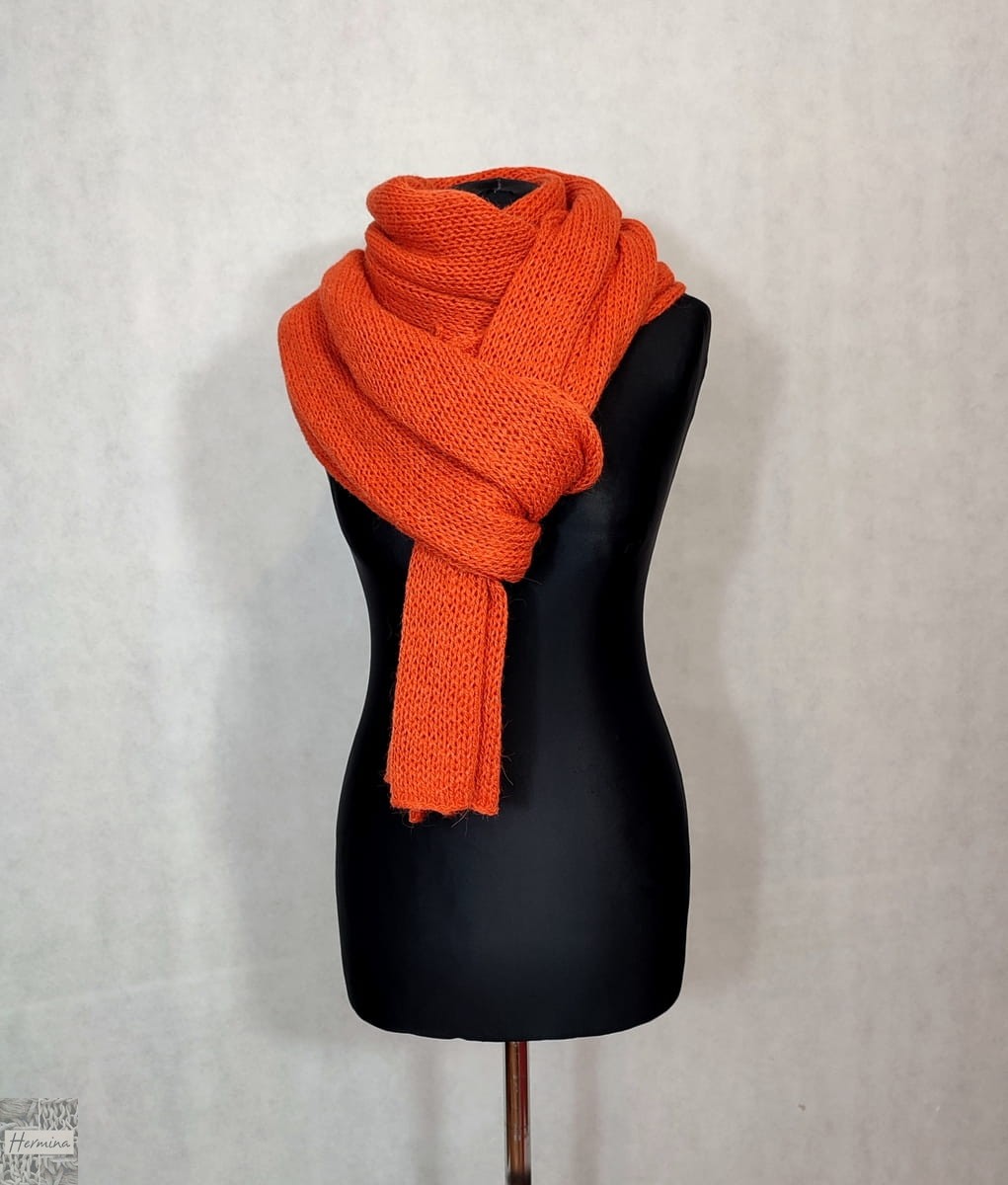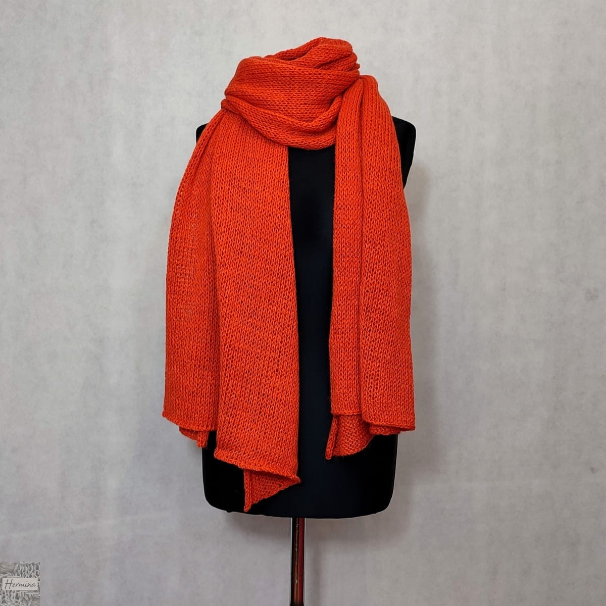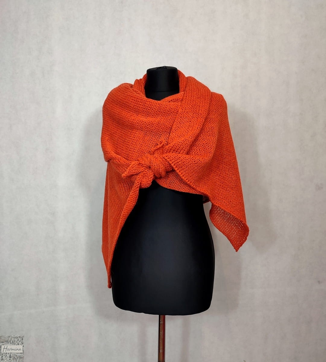 Prezentujemy ciepły, obszerny, miękki szal w kolorze pomarańczowym.