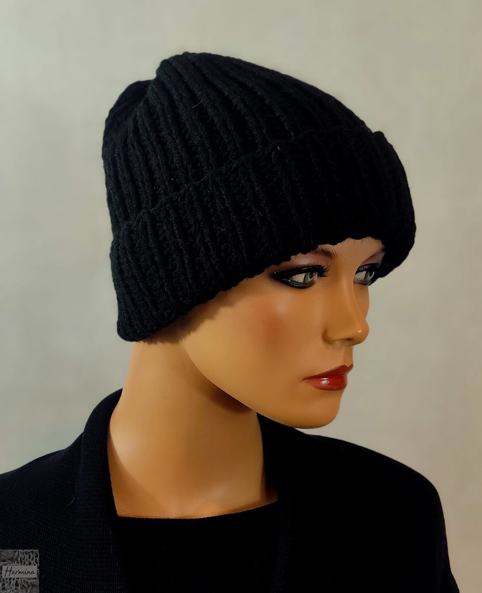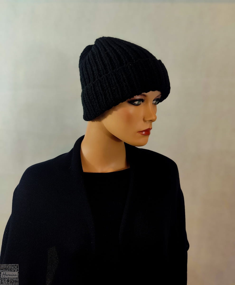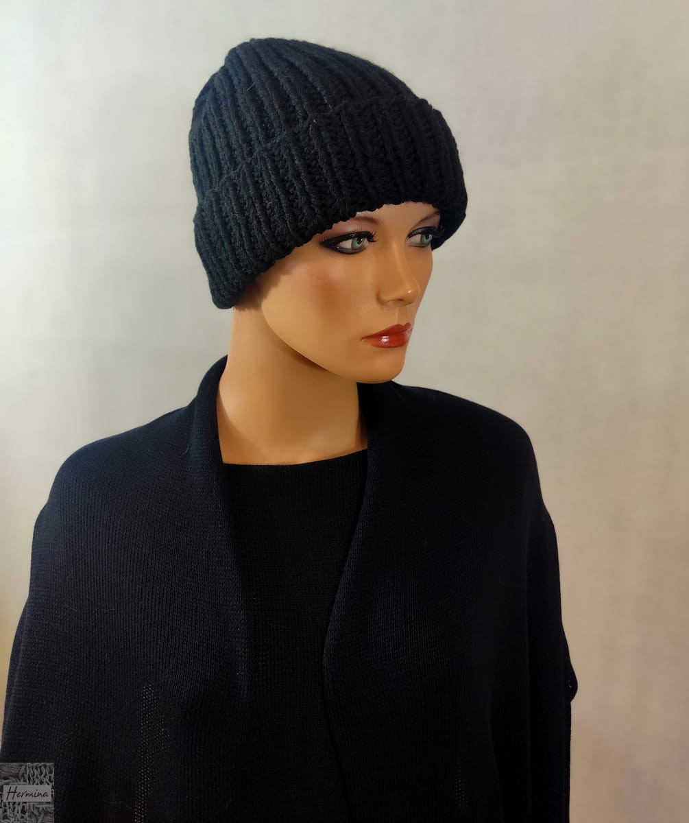 Czapka UNISEX wykonana ręcznie na drutach z włóczki w kolorze czarnym.