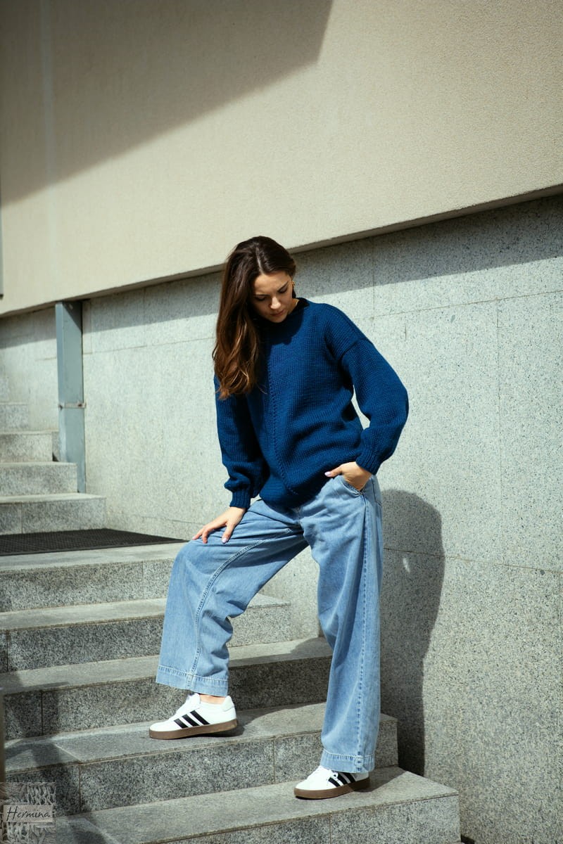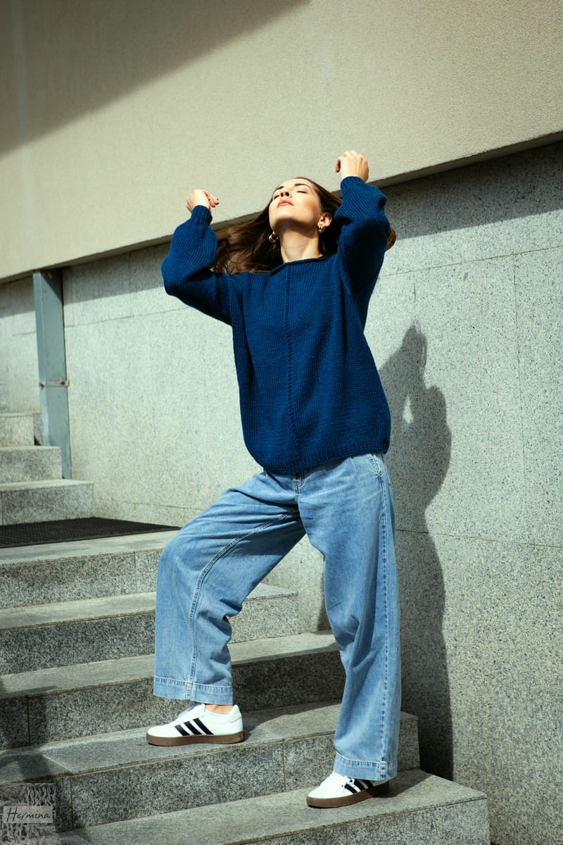 Bardzo ciepły ręcznie robiony wełniany sweter w kolorze morskim ( głębia oceanu).