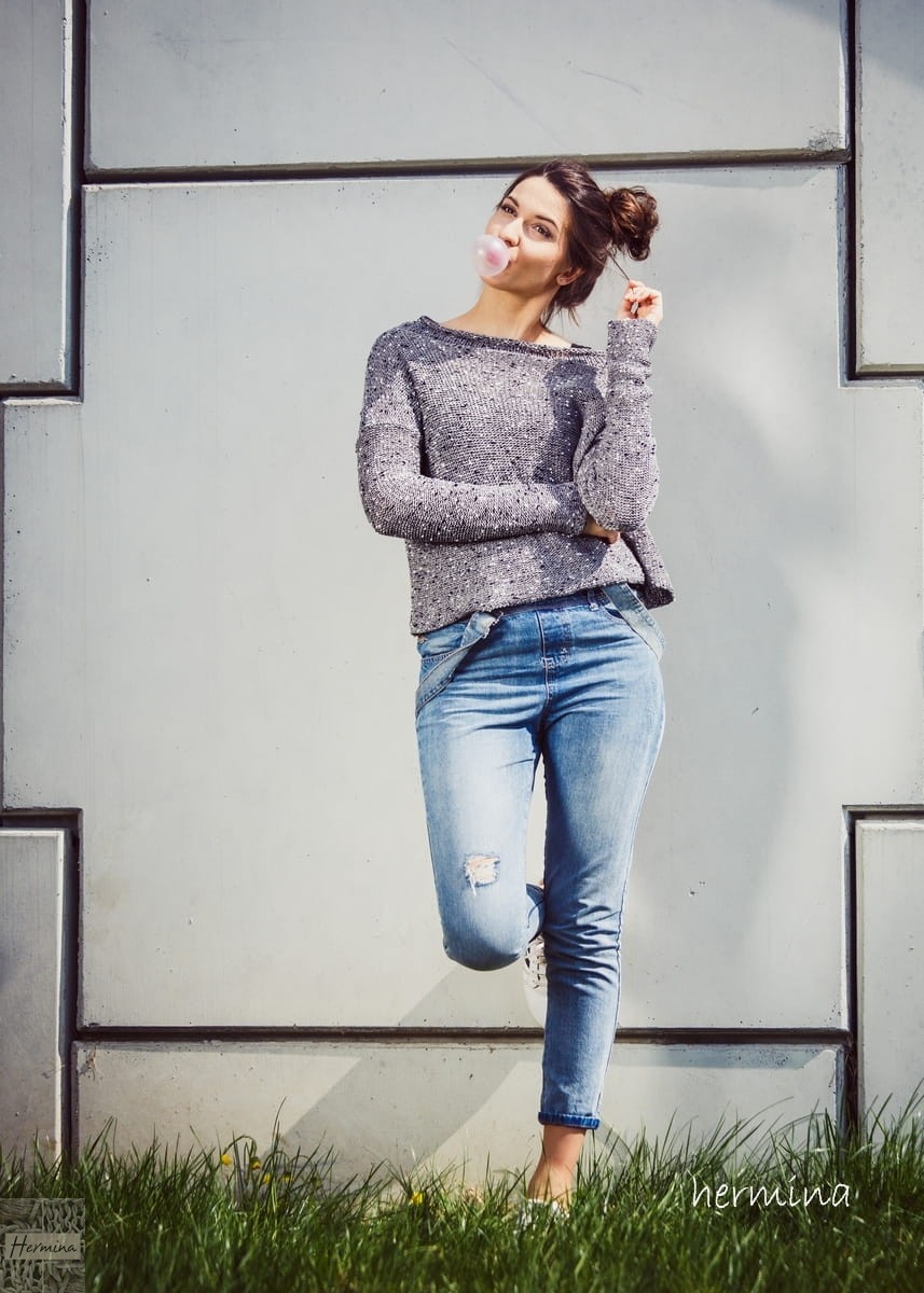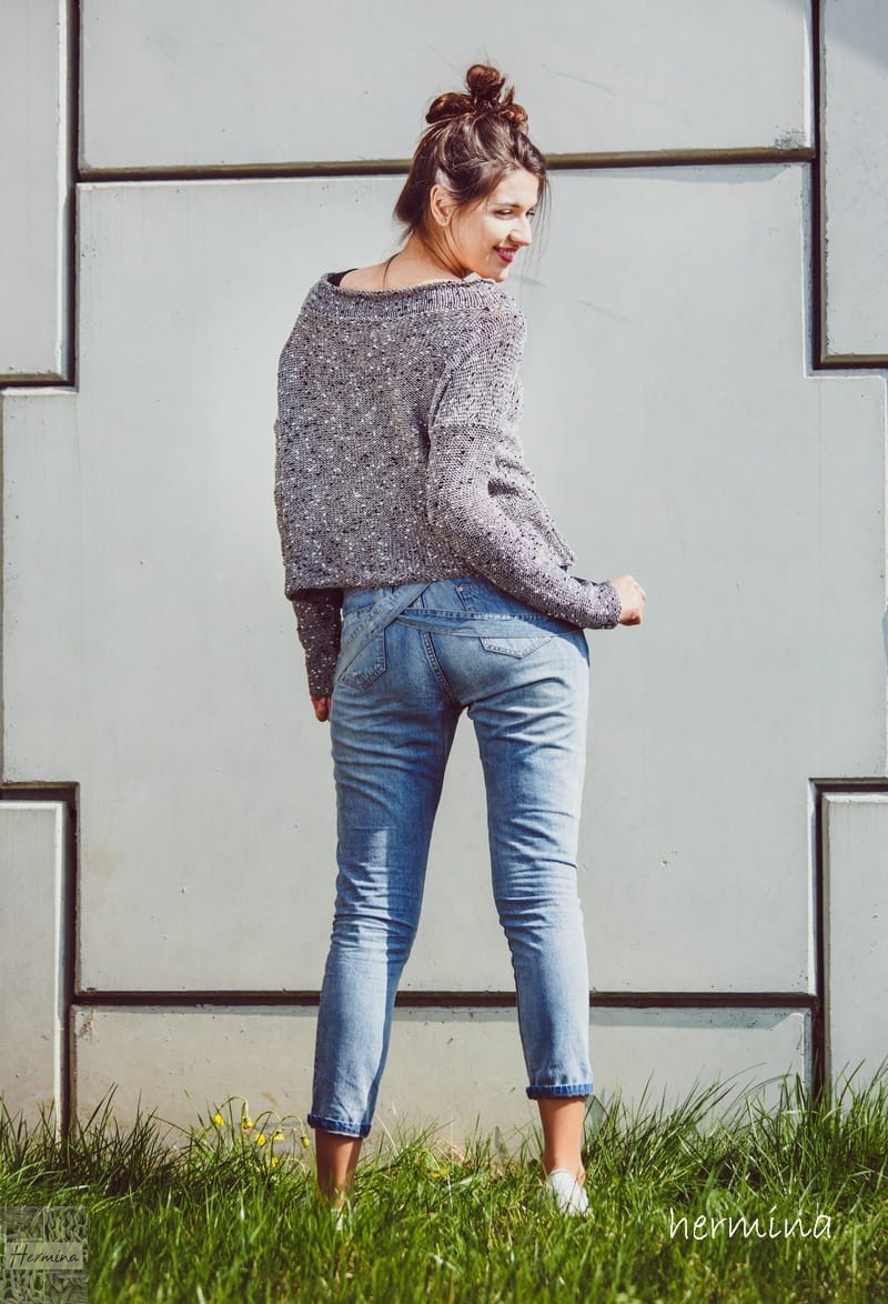 Luźna oversizowa bluzka z dzianiny wykonana z mieszanki bawełny z akrylem, w prostej formie z dekoltem w kształcie łódki . Idealna na każdą porę roku. Luźny swobodny fason świetnie wygląda do dźinsów jak i do spódnic. Dzianina wykonana na ręcznej maszynie dziewiarskiej typu vintage. Dostępna w kolorze szarym z granatową fantazyjną nitką.
