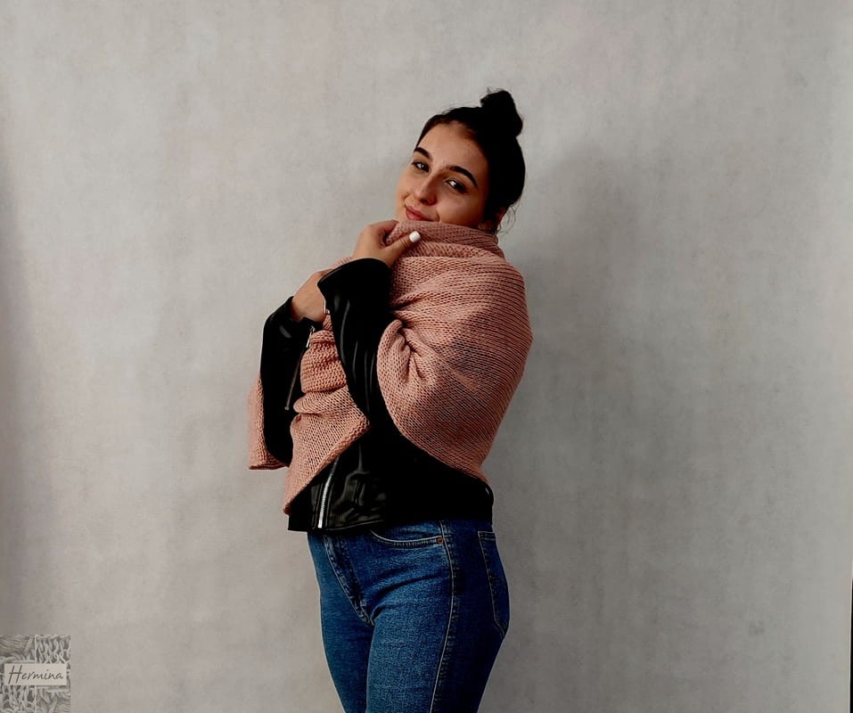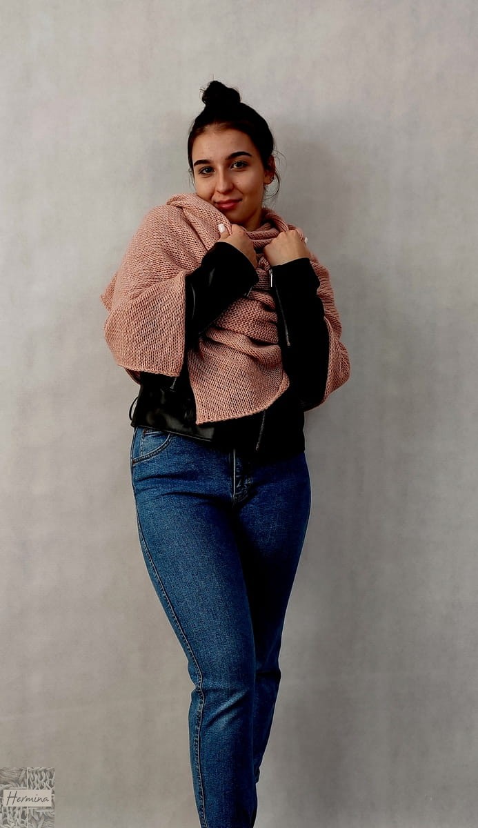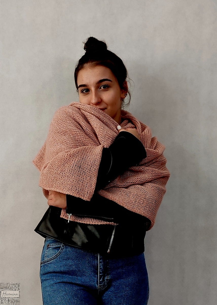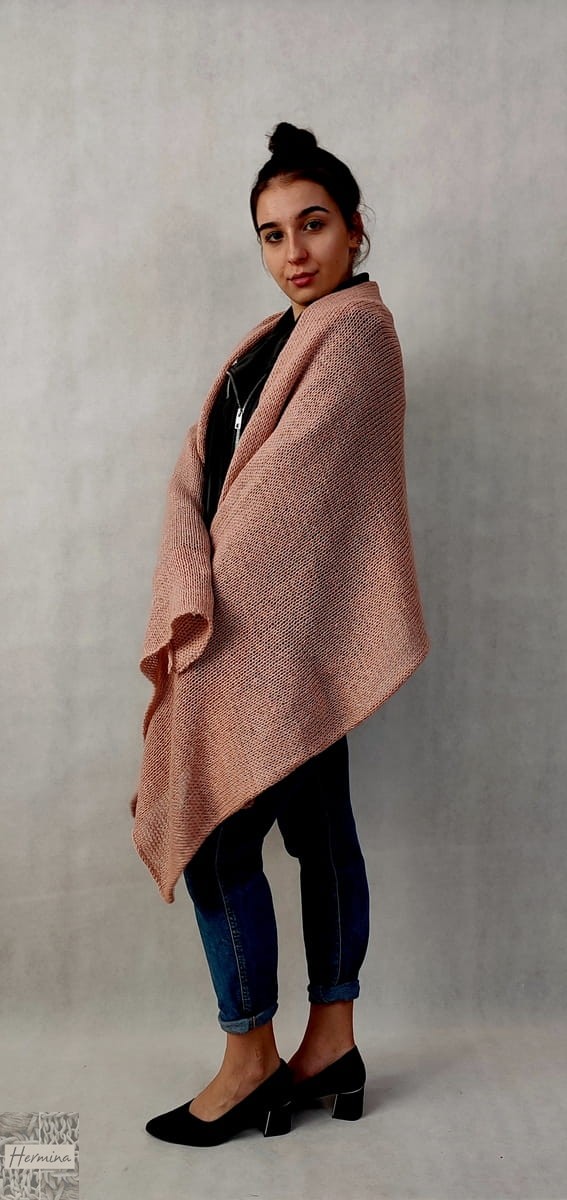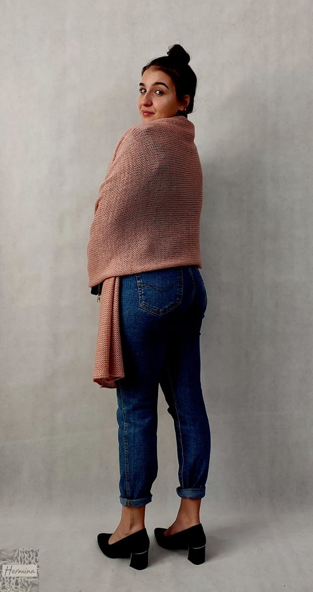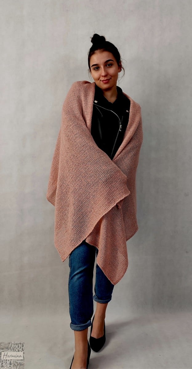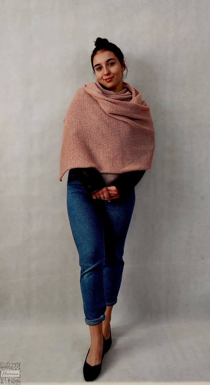 Ciepły, obszerny, miękki szal w kolorze brudnego różu. Można go nosić na wiele sposobów.